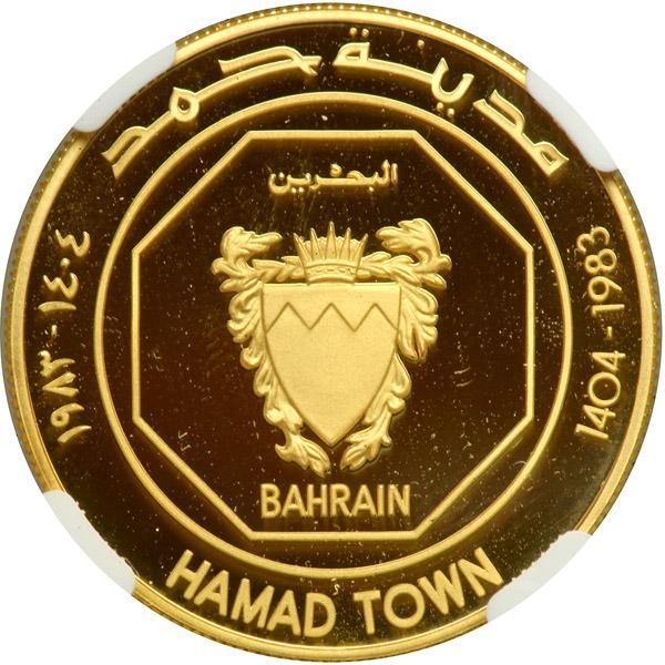 Bahrain. 10 Dinars, AH 1404/1983. Fr-5; KM-X#M3. Weight 0.4717 ounce. On the opening of Hamad Town. NGC graded Proof 69 Ultra Cameo.