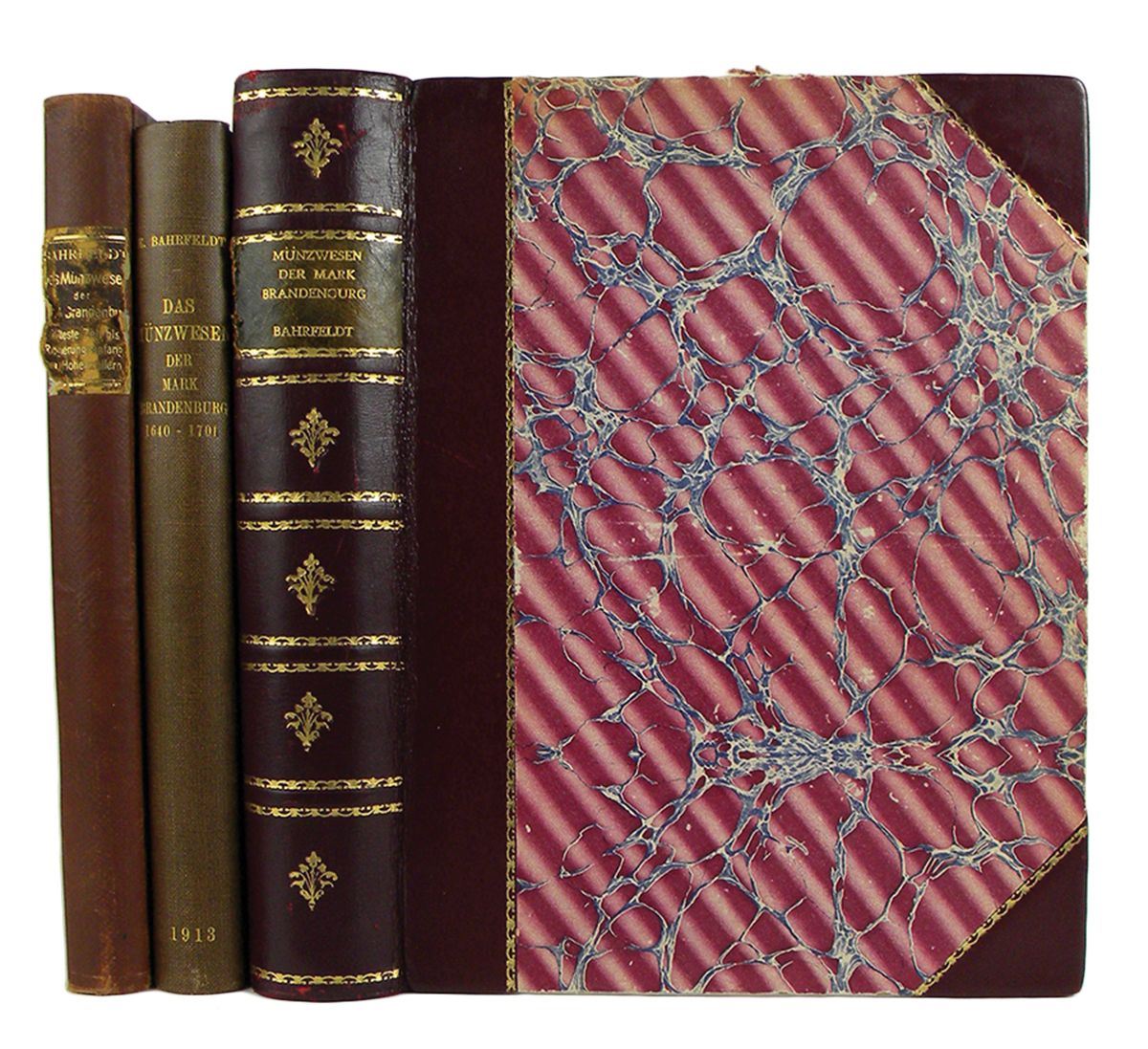 Bahrfeldt, Emil. DAS MÜNZWESEN DER MARK BRANDENBURG VON DEN ÄLTESTEN ZEITEN BIS ZUM ANFANGE DER REGIERUNG DER HOHENZOLLERN / DAS MÜNZWESEN DER MARK BRANDENBERG UTER DEN HOHENZOLLERN BIS ZUM GROSSEN KURFÜRSTEN, VON 1415 BIS 1640 / DAS MÜNZWESEN DER MARK BRANDENBURG UNTER FRIEDRICH WILHELM, DEM GROSSEN KURFÜRSTEN, UND KURFÜRST FRIEDRICH 3. 1640-1701. Berlin: Verlag von W.H. Kühl, 1889 & 1895; Halle A.S.: Verlag von A. Riechmann & Co., 1913. Three volumes, complete. 4to, mixed bindings, cloth and leather. ix, (1), 321, (1); vi, (4), 570, (2); xi, (1), 174 pages; map plate; text figures; tables; 28 lithographic + 25 Lichtdruck + 27 fine plates of coins. Generally a near fine set. A complete set of the rarely offered original edition of this long-standard work on the coins of Prussia, covering the medieval and modern issues to the end of the eighteenth century. Clain-Stefanelli 9497*. Grierson 144.