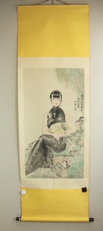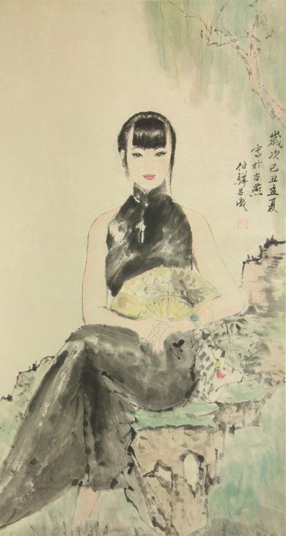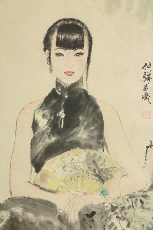 Portrait of beauty wearing cheongsam (qipao) with fan; Chinese ink and watercolour on paper; hanging scroll; signed Bai Bohua (b.1944); inscribed with 1 artist seal; 94 cm × 51.5 cm