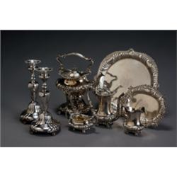 Consisting of a teapot-on-stand, demitasse pot, cream jug, sugar bowl, pair of candlesticks and two trays; each engraved with an armorial shield, the four-piece service also engraved with the initial A. Each impressed with factory mark and S3302. Some light scratching to surfaces.