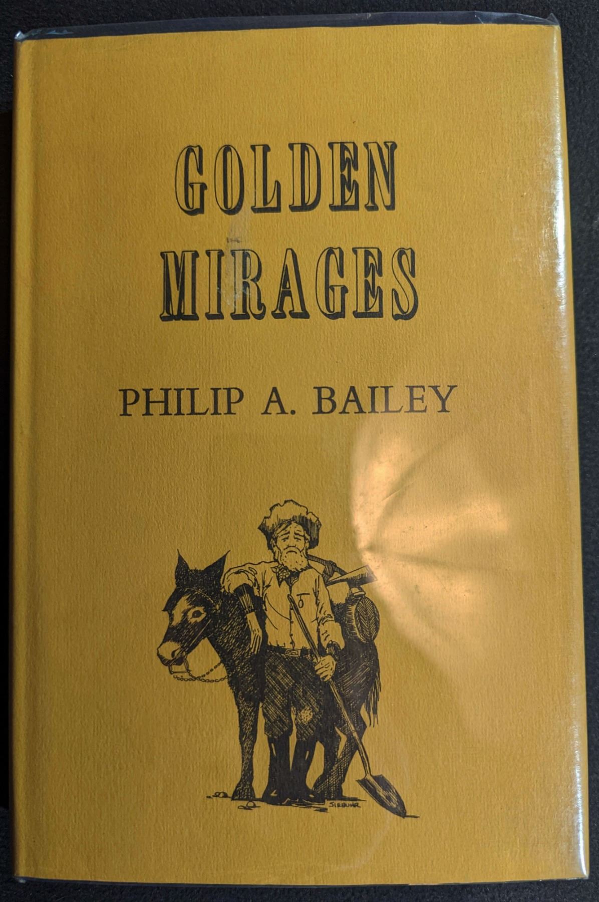 Bailey, Philip A. GOLDEN MIRAGES. Acoma Books. 1971. 8vo. (6), xvii, (11), 353, (9) pages. Ramona. special commemorative edition. original blue cloth, gilt; dust jacket in protective sleeve. frontispiece. illustrated. maps. Fine. This book is a collection of tales of treasure hoards and lost mines as researched by the author. One of the essential works on the story of the Lost Pegleg Mine, the Legendary Three Gold Buttes, and considerable information on other lost lodes. Lot weight: 1 lbs 15oz. Subject(s): Buried Treasure, Lost Mines.