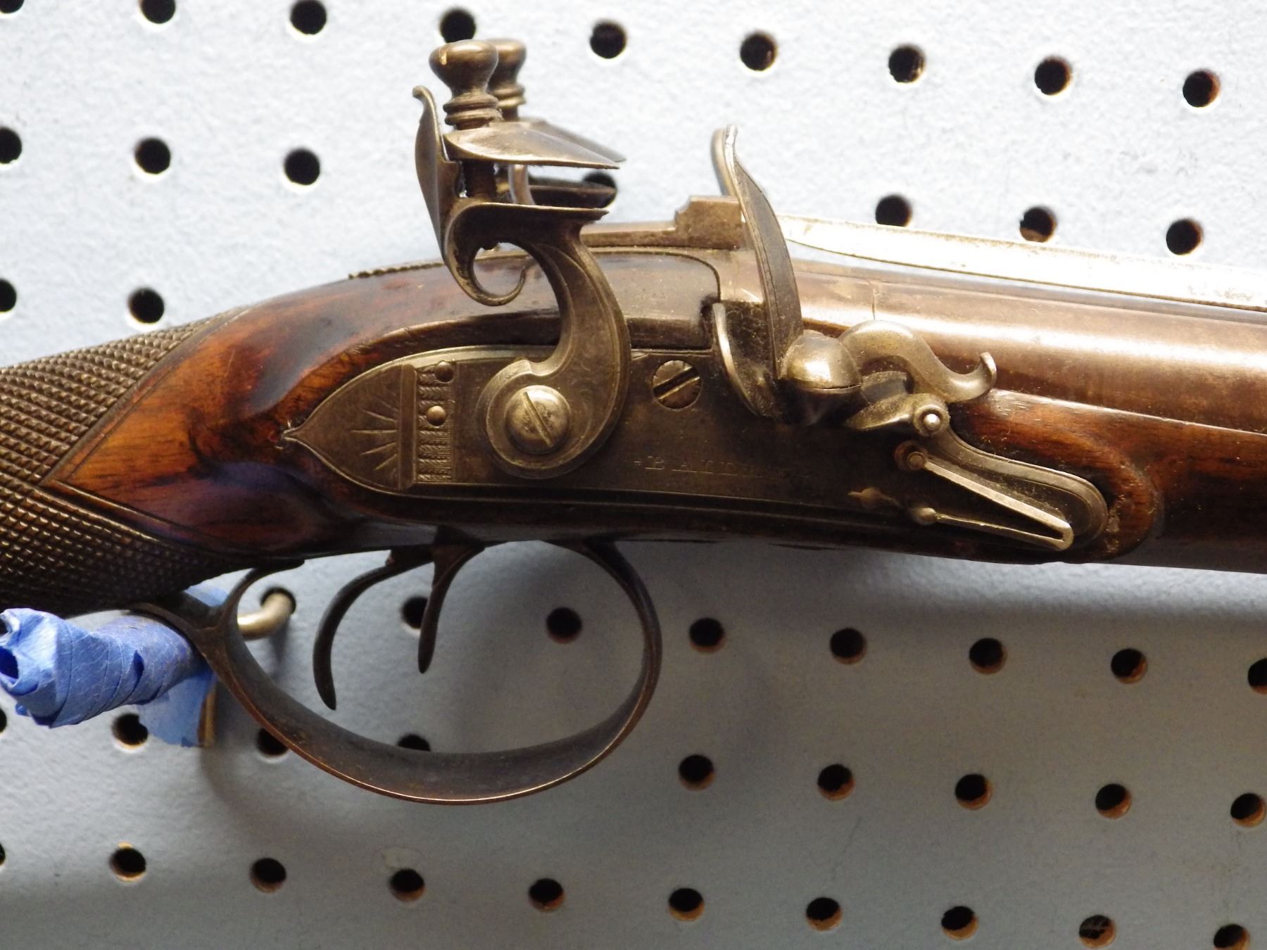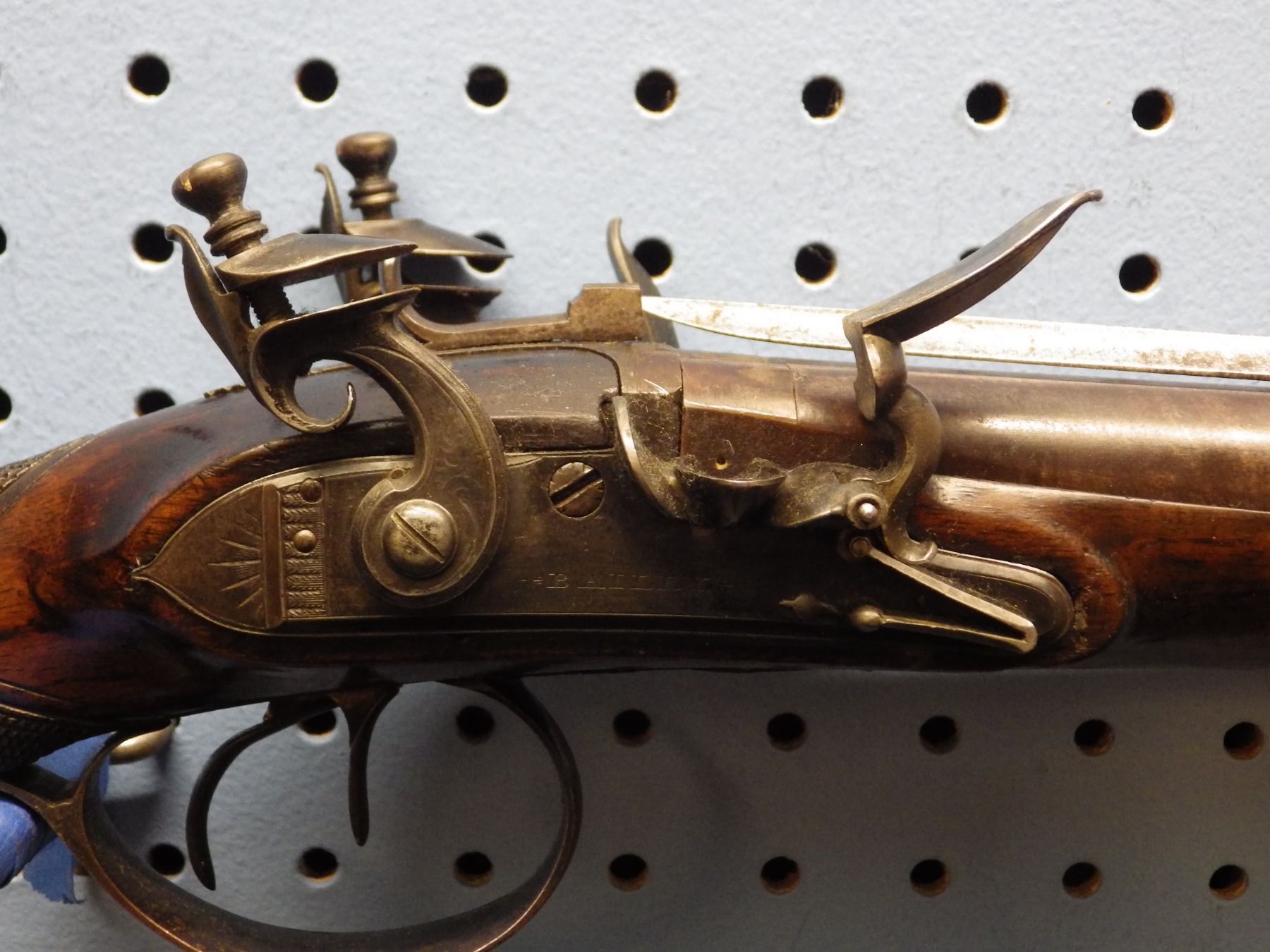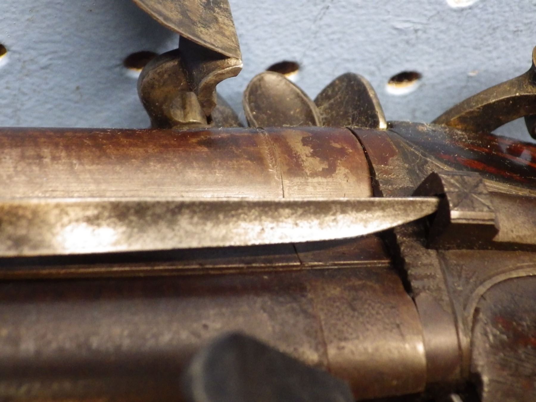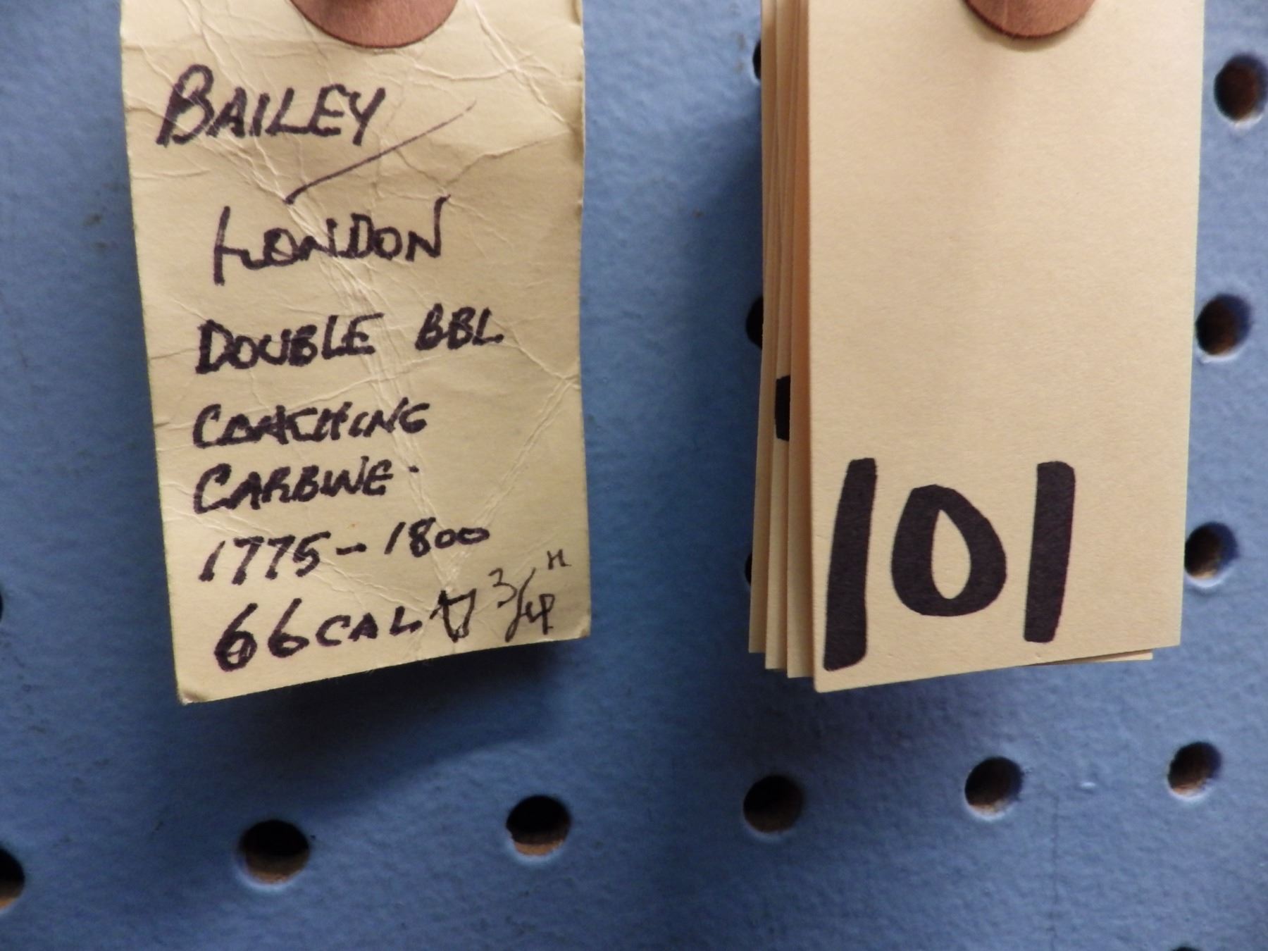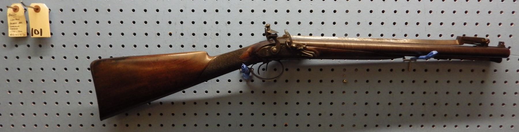 Bailey London flintlock dbl barrel coach gun, circa 1775-1800 .66 caliber, 17 3/4" barrels, with spring bayonet… CONSIGNOR # G96