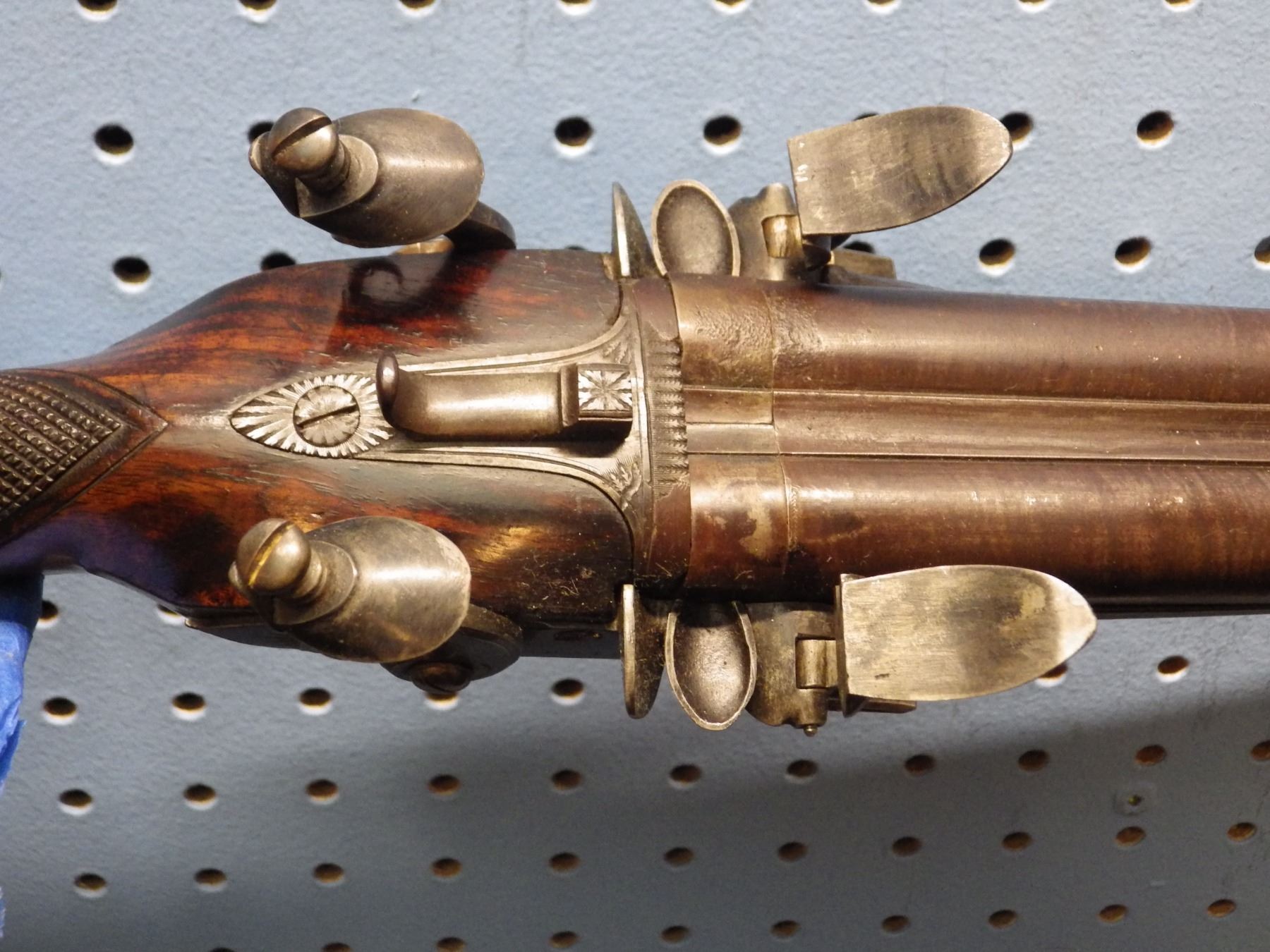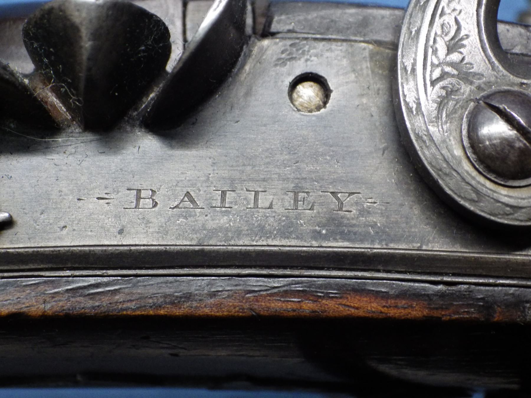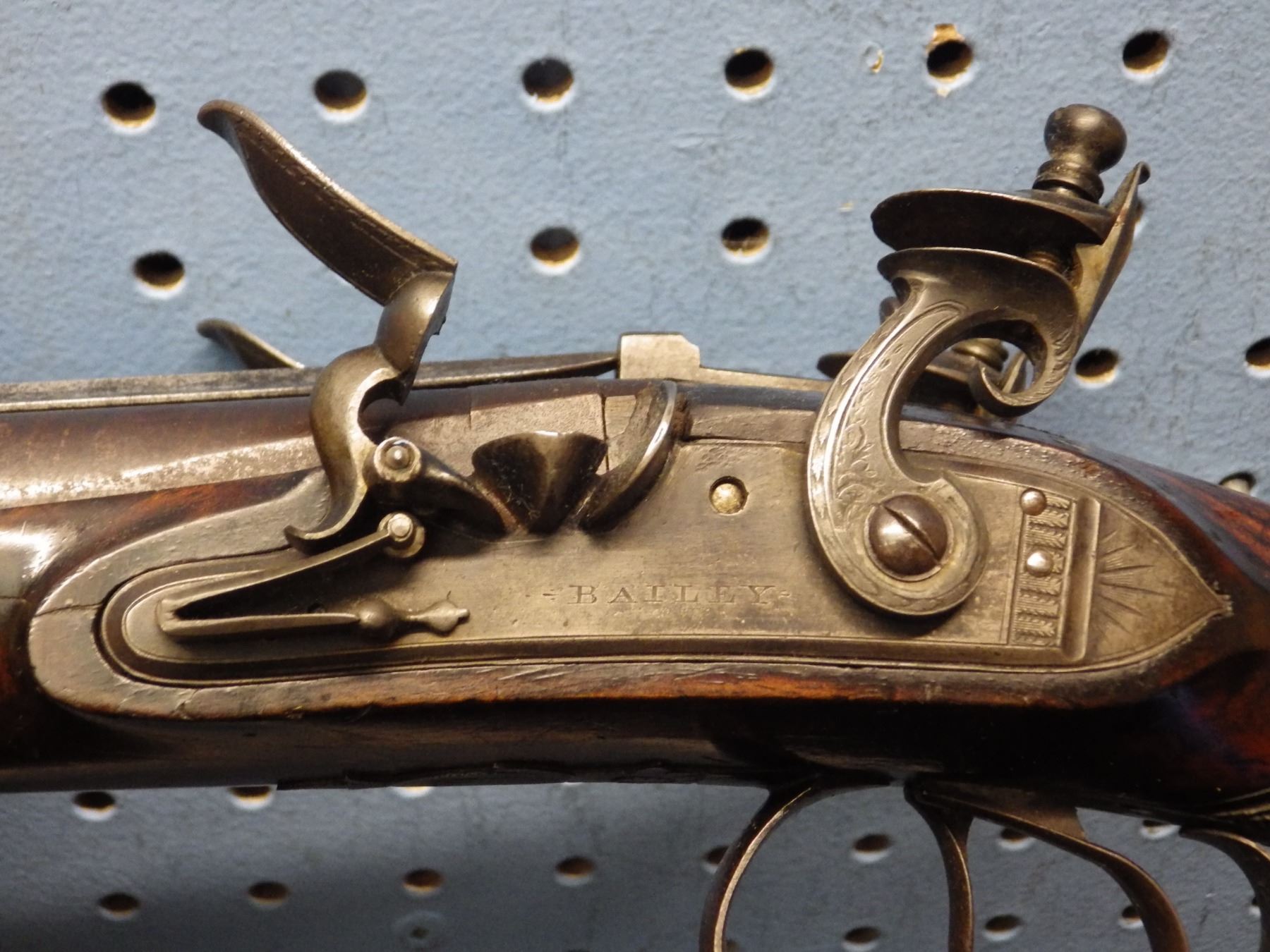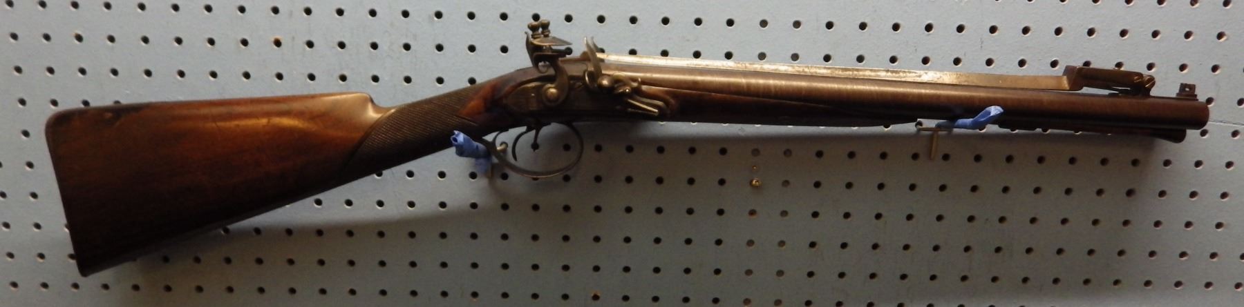 Bailey London flintlock dbl barrel coach gun, circa 1775-1800 .66 caliber, 17 3/4" barrels, with spring bayonet… CONSIGNOR # G96