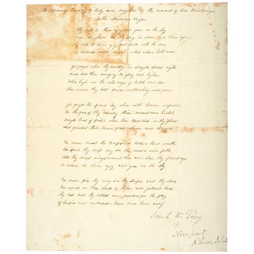 <Our item number 140912><B>[Bainbridge, Commodore] War of 1812 Era Poem.</B> Handwritten poem titled "To the American Eagle," signed, "Sarah W. Perry" of Newport, RI, 1 page, 10 x 8 in., n.d. Honoring William Commodore (1774-1833), the American Naval Commodore, who sank the British Frigate H.M.S. Java as Commander of U.S.S. Constitution, during the War of 1812. In part: "Fly back to thine eyry, and gaze on the sky, From the shame on thy flag, in scorn turn thine eye - Fly back to thine eyry, and dwell with the sun, For dastards would tarnish what valour hath won. …" Some scattered toning. Boldly penned in brown ink and easily legible. <BR>Estimated Value $600 - 800. <BR><BR>Our item number 140912<BR><IMAGES><P ALIGN="CENTER"><IMG SRC="http://www.goldbergcoins.net/liveauction/49jpegs/140912.jpg"> </P></IMAGES>