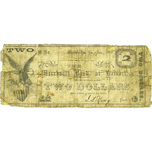 <B>Bainbridge, GA- merchants Bank at Bainbridge</B></I> $2 Jan. 1862 G8<BR>A very rare note from a bank which issued only 1862 notes in $1 and $2 denominations. <B>Good,</B></I> with some small pieces missing, backed.