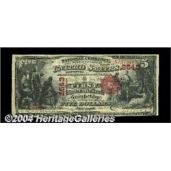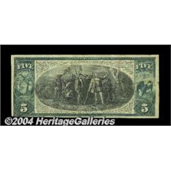 Bainbridge, NY - $5 1875 Fr. 405 The First NB Ch. # 2543A new piece to the census from this scarce Chenango County bank, which now totals ten large examples. This First Charter $5 is certainly one of the nicest, grading a bright Very Fine-Extremely Fine, with sharp signatures and a vivid red overprint. There is one small split at the bottom mentioned here only for total accuracy in grading. Expect this attractive note to reach or exceed... <BR><BR><B>Important notice:</B> Heritage usually auctions material at the rate of 200-250 lots per hour. On some occasions eBay Live bid software or the Internet may not be able to keep up with the pace of the auction. We recommend placing a realistic absentee bid now as insurance to avoid disappointment. Occasionally the auctioneer may eliminate or reject an eBay Live bid, and the auctioneer may also reopen a lot after the close of the eBay live bidding (usually because we missed an audience bid), and may reject your bid even if it shows you as the winning bidder. By bidding via eBay Live, you agree that Heritage may award the lot to another bidder at its sole discretion under the circumstances described above or any other reasonable circumstances. Since eBay bids are not shown to us until we open the lot on the floor, we treat those bids just like floor bids. In most cases the floor responds before the eBay bid is presented to us, due to Internet lag time, so for consistency we have made it a policy that floor bids are always considered first over tie eBay live bids. Also please note that all Heritage lots purchased through eBay Live carry a 20% Buyer's Premium. Please make sure you read the Terms and Conditions before you bid. <BR><BR><B>IMPORTANT ANNOUNCEMENT ABOUT RESERVES:</B> Heritage now divulges all reserves on its web site 7 days before every auction. If you want to know whether the reserve on this lot has been met, and if not, what the reserve amount is, please visit this lot page on the HeritageCoin.com web site, or email: bid@HeritageGalleries.com