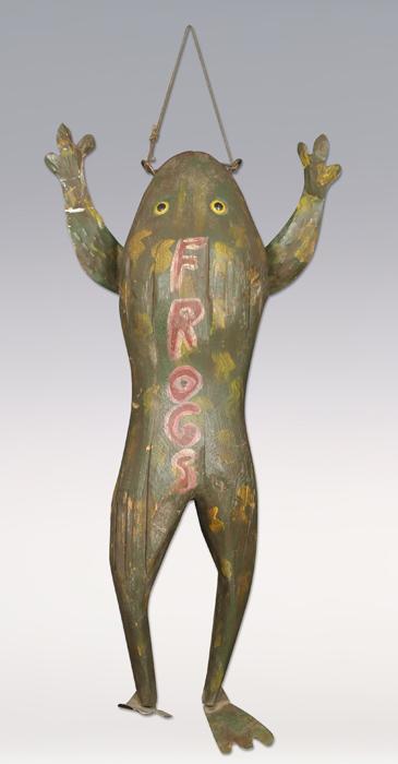 Bait Shop Trade Sign. 43" long. Wood body in shape of frog. Tin feet. Taxidermy eyes. Condition Report: Paint shows some fading, but in fine condition.
