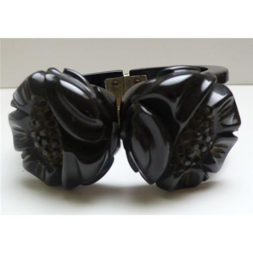 <tr><td>Title:Bakelite Black Acorn Hinged Bangle</td></tr>