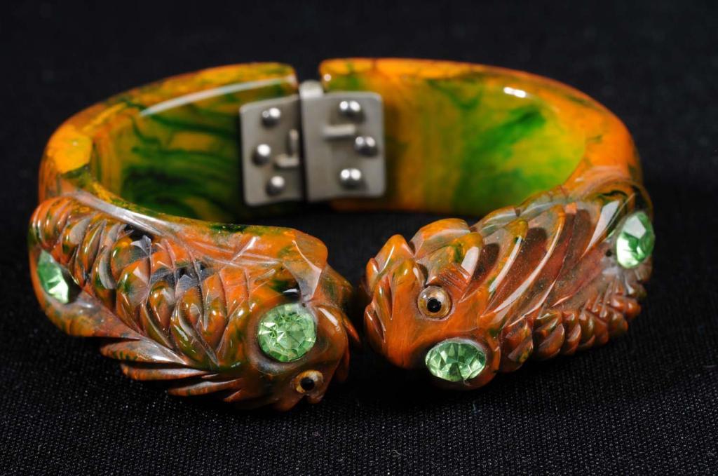 Description Deeply carved green and butterscotch marble. With green stone and glass eyes. Condition (Excellent). Size 2 - 1/4" x 3/4".