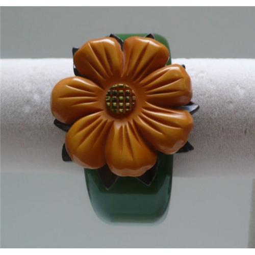 <tr><td>Title:Bakelite Green Hinged Flower Bangle</td></tr>