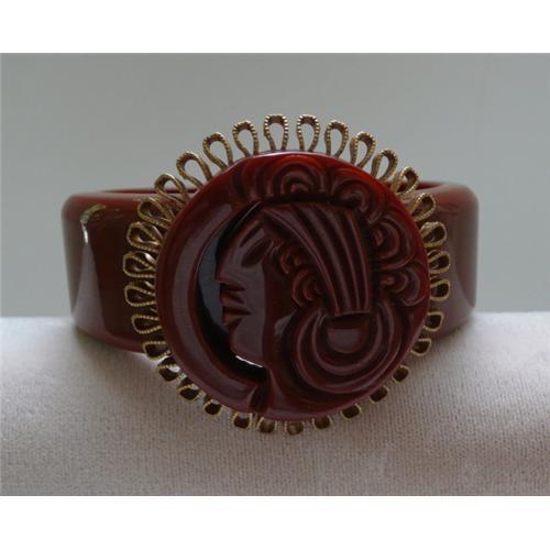 <tr><td>Title:Bakelite Hinged Mayan Head Bangle</td></tr>