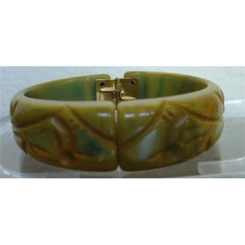 Vintage carved Bakelite hinged bracelet. <p> Color: A marbled or mottled pea green with shades of butterscotch gold <p> Age 1930's <p> Measurements: Approximately 3" by 2 1/2" by 5/8" <p> Condition: Excellent vintage condition; Hinge works well<p> A client of ours and a collector of bakelite jewelry has finally decided to let go of a few of her treasures and we are happy to offer them to you for sale.