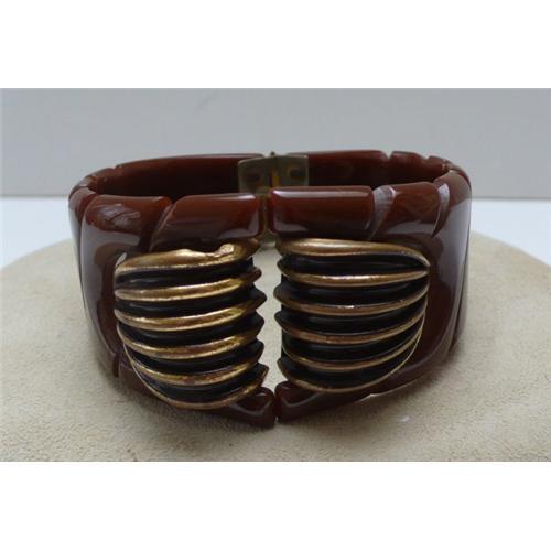 <tr><td>Title:Bakelite & Metal Brown Hinged Bangle</td></tr>
