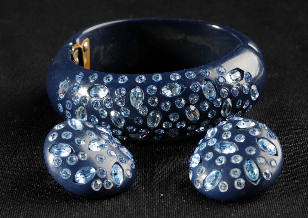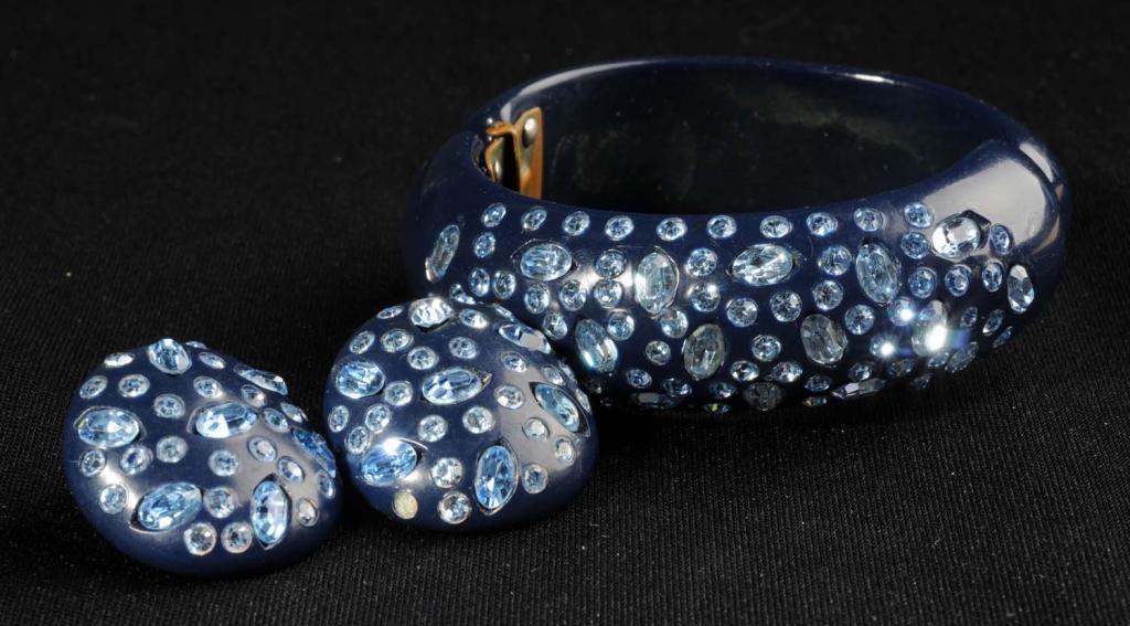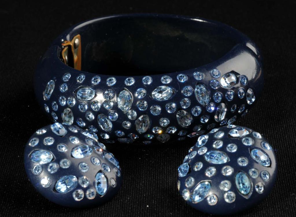 Hinged bracelet and clip-on earrings each have rhinestones. This is a Weiss signed piece. Condition (Excellent).