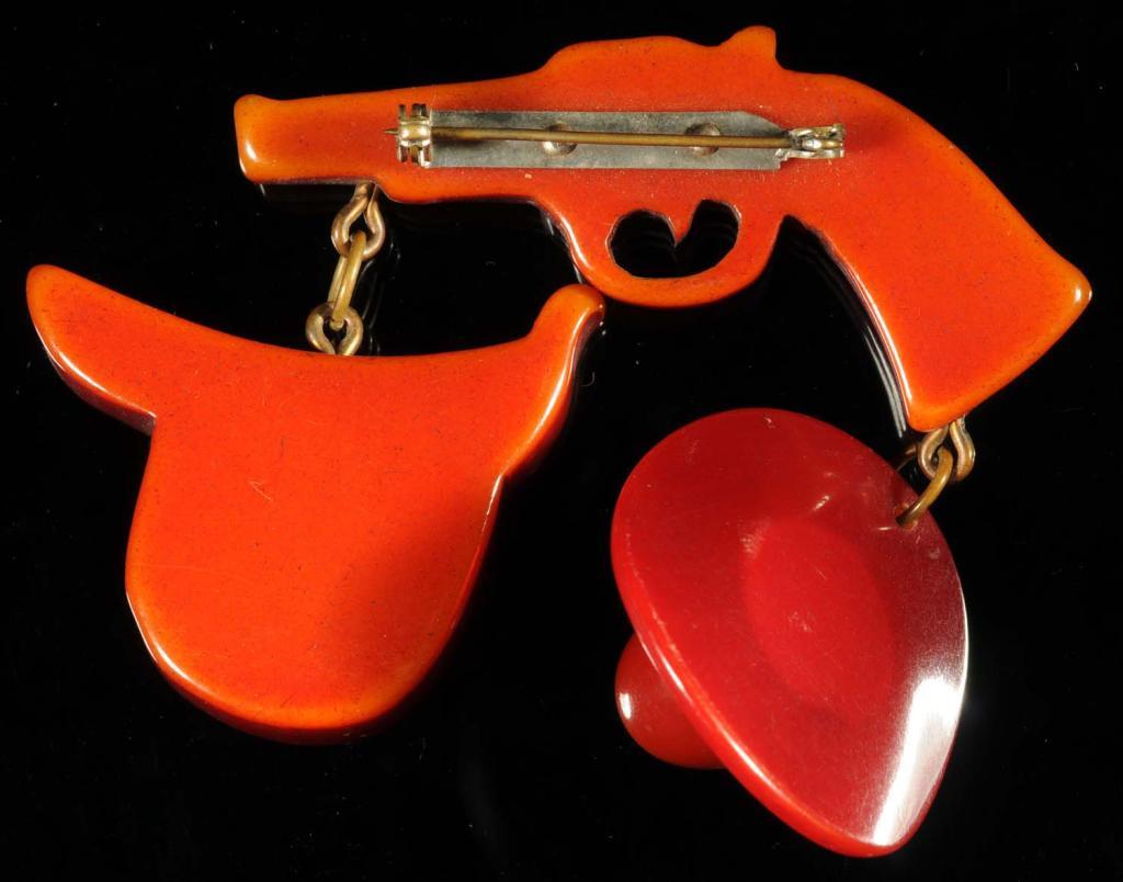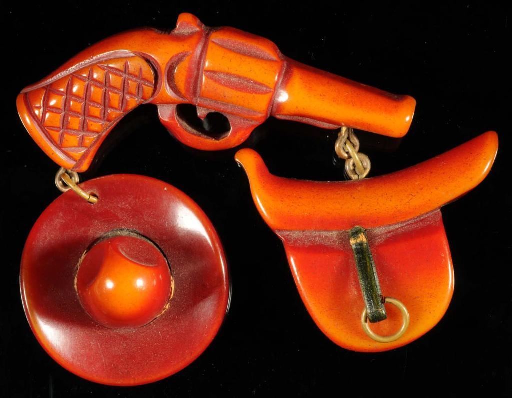 Description Gun is 2 - 1/2-inches long. Saddle and hat are 1 - 1/2-inches long each. Condition (Excellent). Size 2 - 3/4".