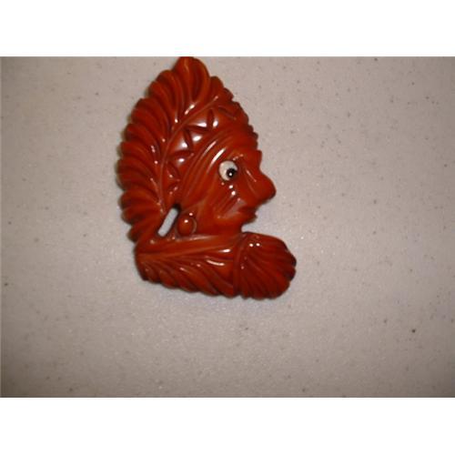 Bakelite carved Indian Chief Pin.Passed Simichrome test.S/H/I calculated at time of sale and NC S/U tax added as applicable