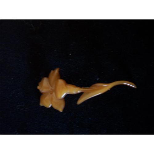This is a beautiful pin.I do not know if it is bakelite or some type of plastic material.On the back it says BUCH+DEICHMANN-DENMARK.It also has the number 2 on it.Also has B+D and an R in a circle.Very light weight and measures 2 3/4" long.A butterscotch color.