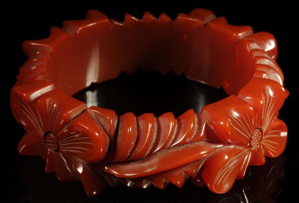 Description Heavy, deeply carved bracelet with floral pattern. Condition (Excellent). Size 2 - 1/2" Dia.