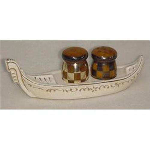A pair of salt and pepper shakers, 1 1/2" tall. Amber bakelite overlayed with silver with a checker board pattern one in bright finish and one in dark finish to indicate salt and pepper. Both sit in a ceramic condola marked made in occupied Japan.