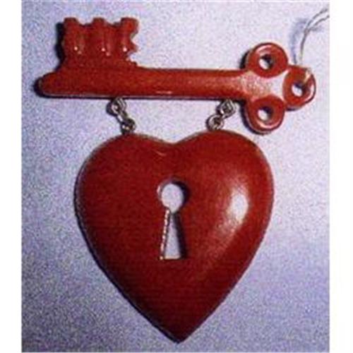 Fabulous Bakelite bright red heart with key. Famous Life magazine pin. It is in excellent condition with
