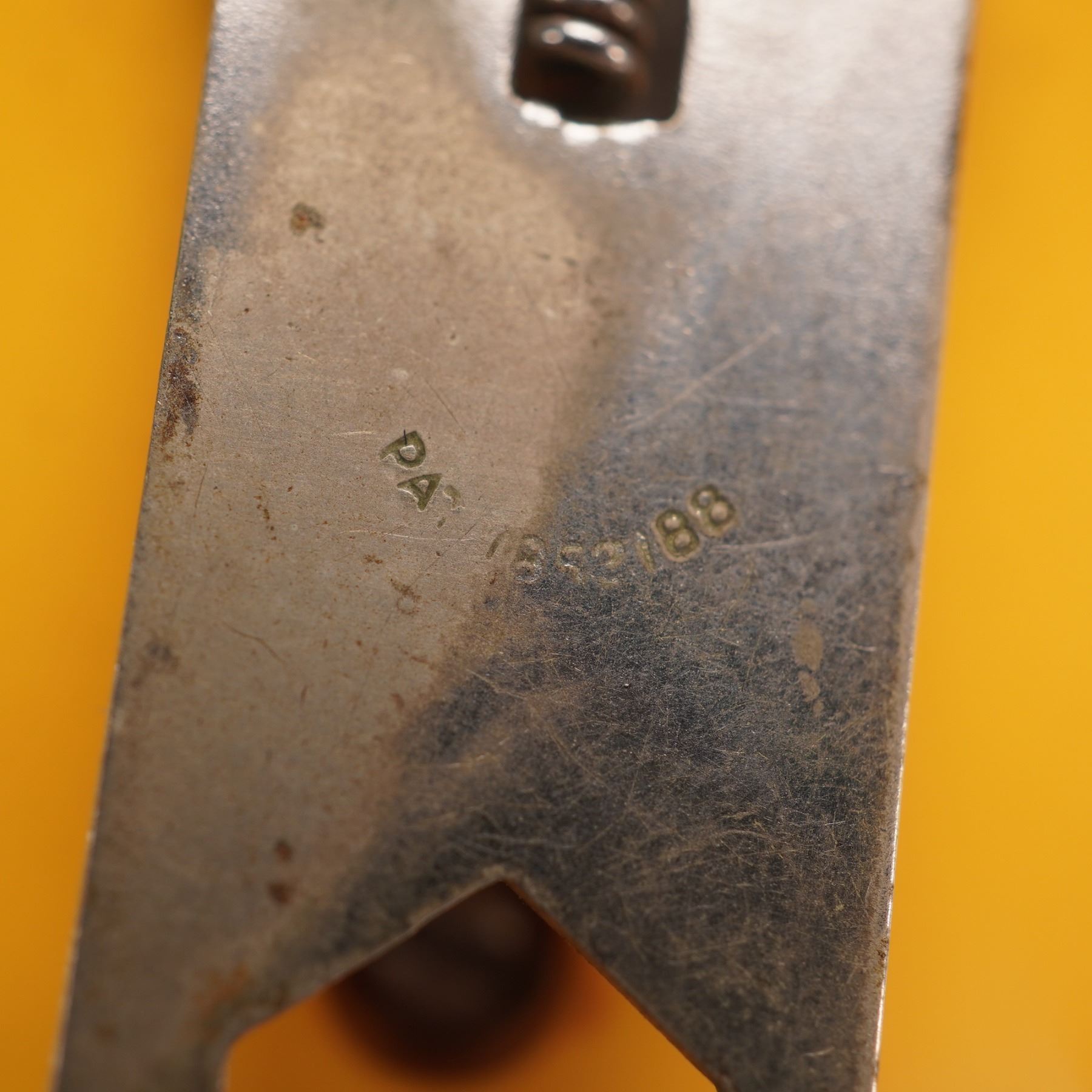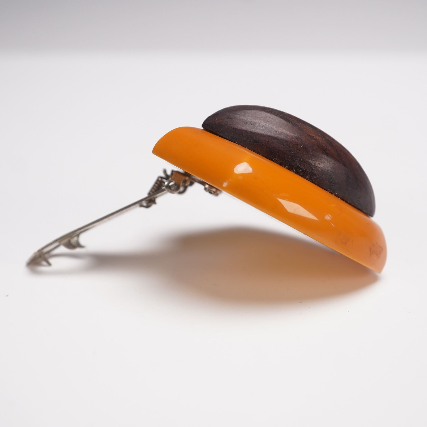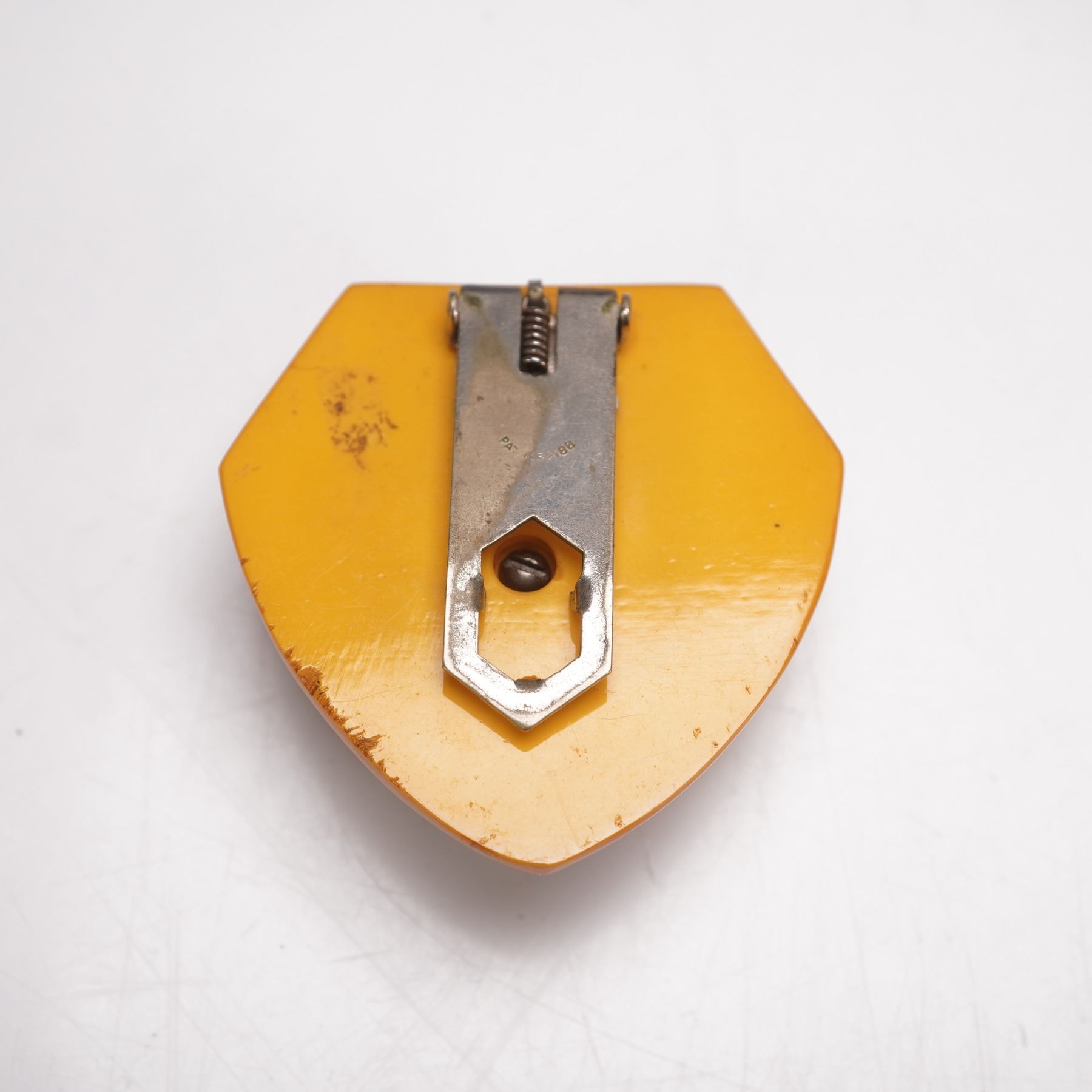 This 1930s Art Deco dress clip is fashioned from two contrasting materials, combining a butterscotch Bakelite panel with a carved dark wood element fitted together in a shield form. The reverse is equipped with a spring-loaded metal clip stamped with patent number 1852188, dating the design to the early 20th century. The pairing of molded plastic and hand-carved wood showcases the inventive material combinations typical of period costume jewelry.