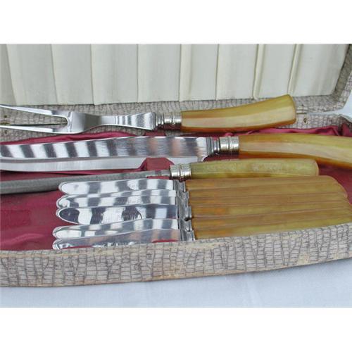 Bakelite knife set with stainless steel blades and bakelite handles, 6 knives and a large carving knife with knife sharpener.