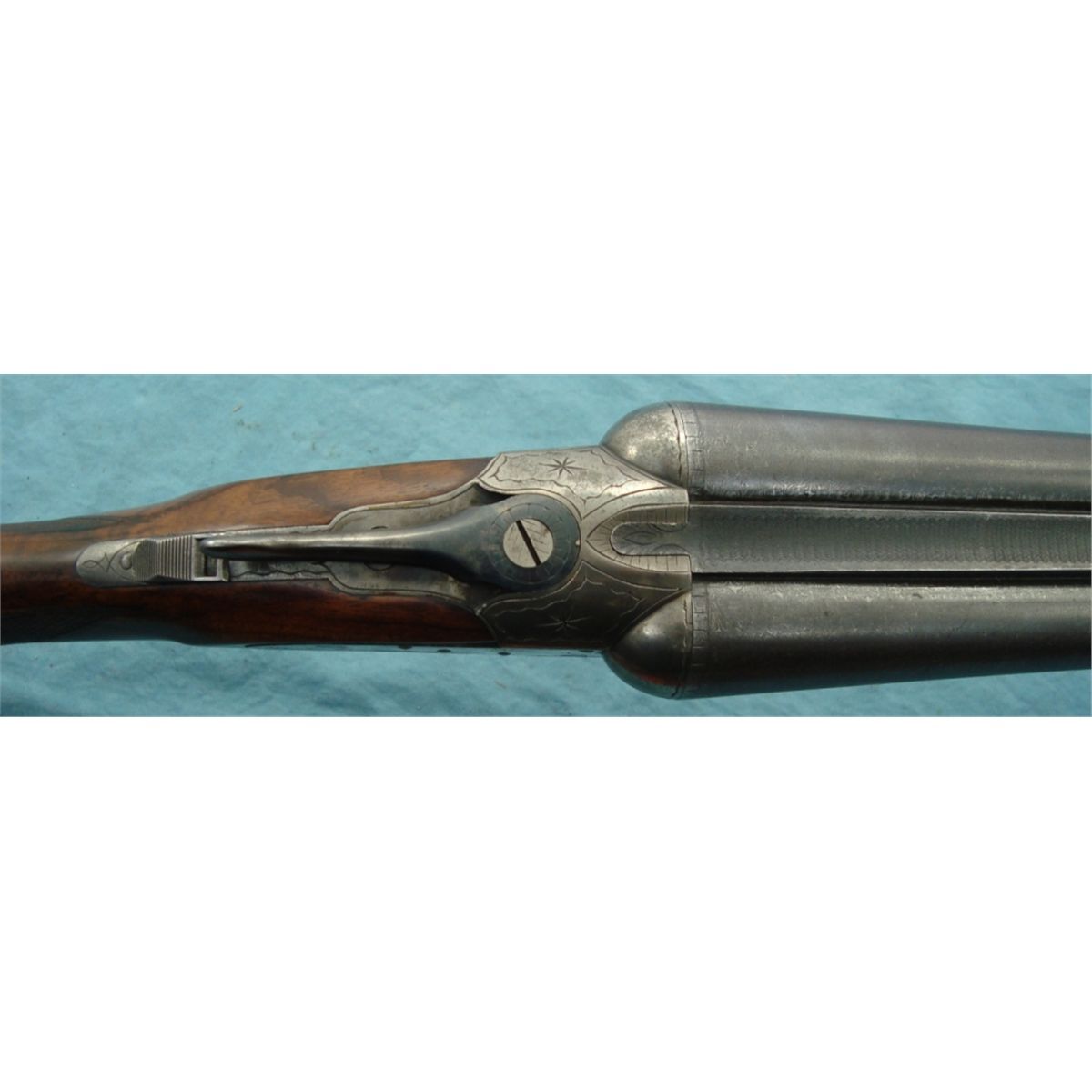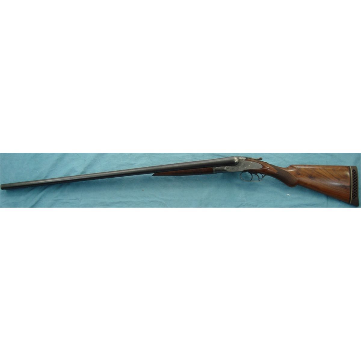 #5454; 12 ga. w/32" Damascus bbls. & bright bores. Case color receiver is fading to silver w/engraved hunting dogs on both sides. Pistol grip stock is checkered in good condition w/high figure walnut. Butt pad has been added w/approx. LOP 13 7/8". Action is tight & mechanically gun seems good.