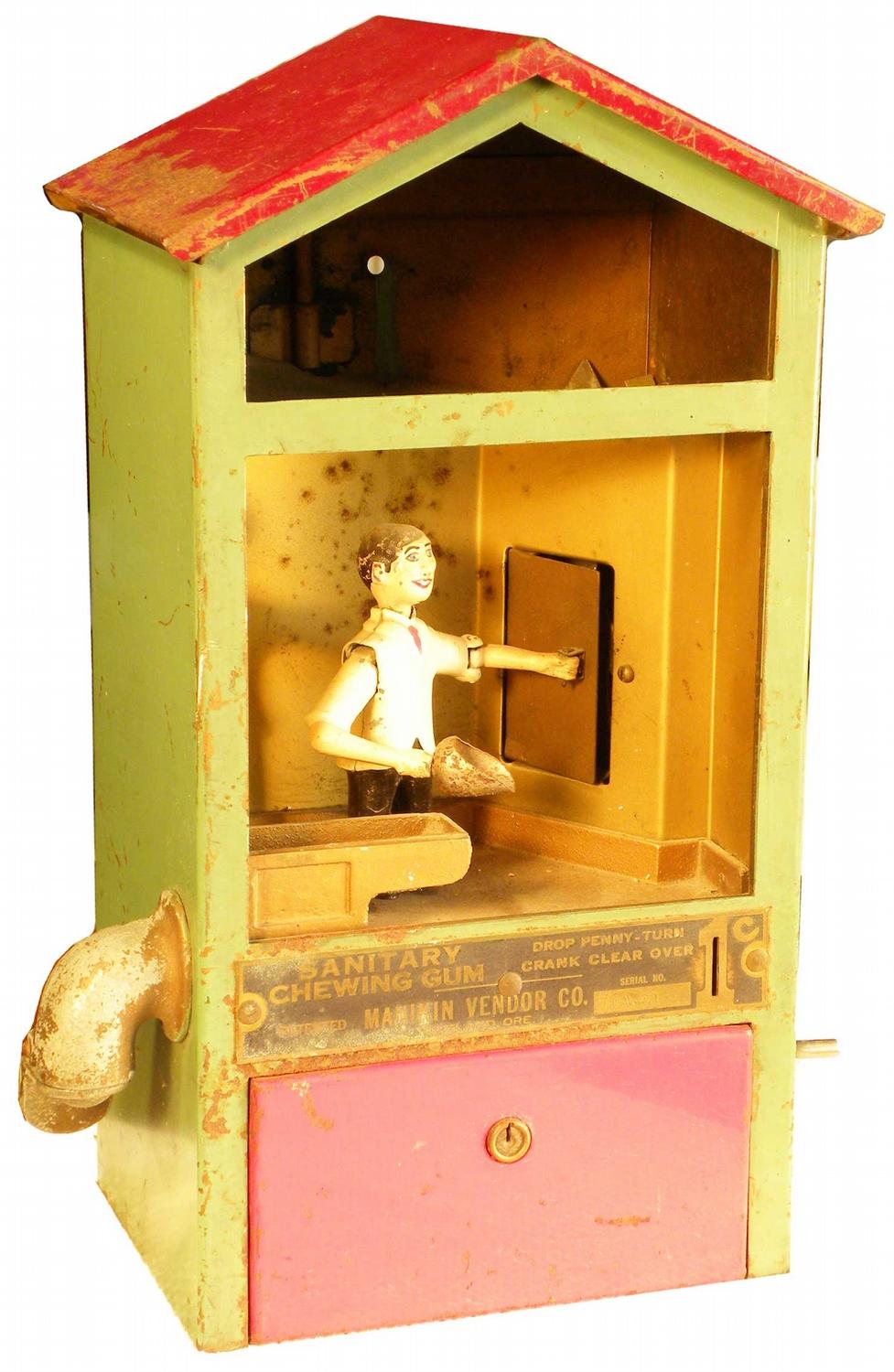 Baker Boy Gum Machine. Manikin Vendor Co. Portland, OR. No glass, rust otherwise very good original condition, no key. 10 X 16 X 6 inches.