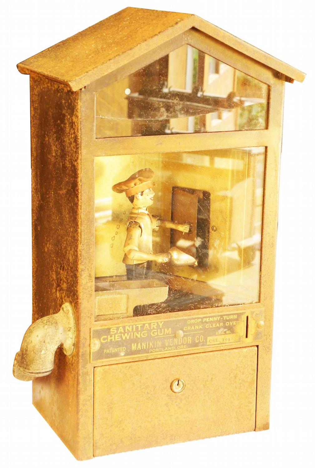 Baker Boy w/hat Gum Machine. Manikin Vendor Co. Portland, OR. Not working fair original condition, no key. 10 X 16 X 6 inches.