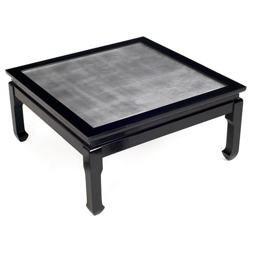Baker Furniture coffee table, ebonized wood frame with top of silver leaf under glass,32in.w x 32in.d x 15.5in.h, nicely refinished,very good condition