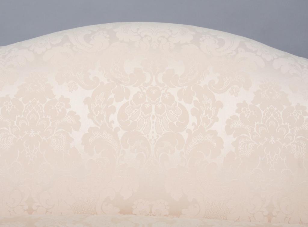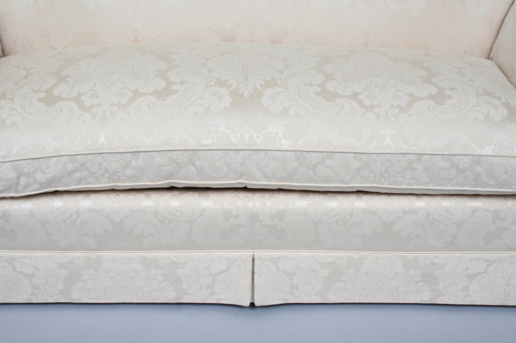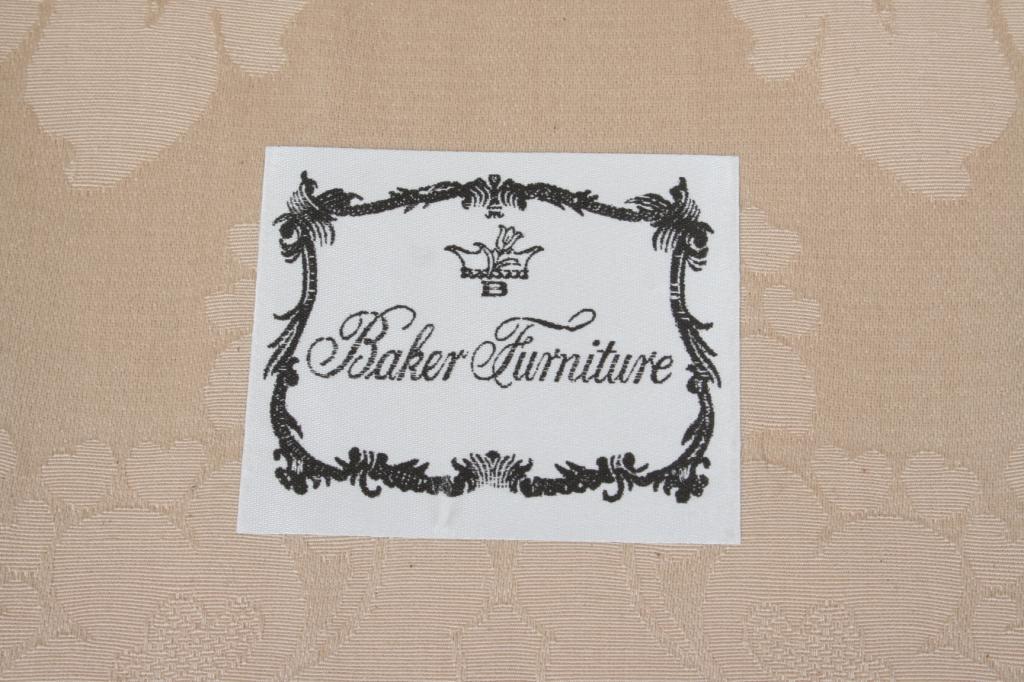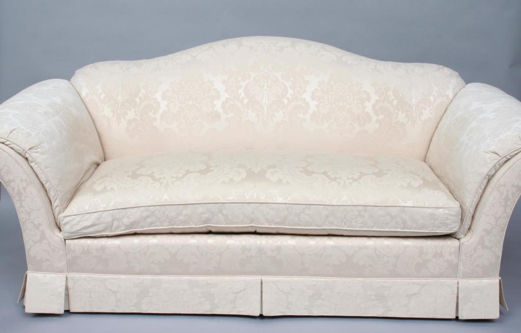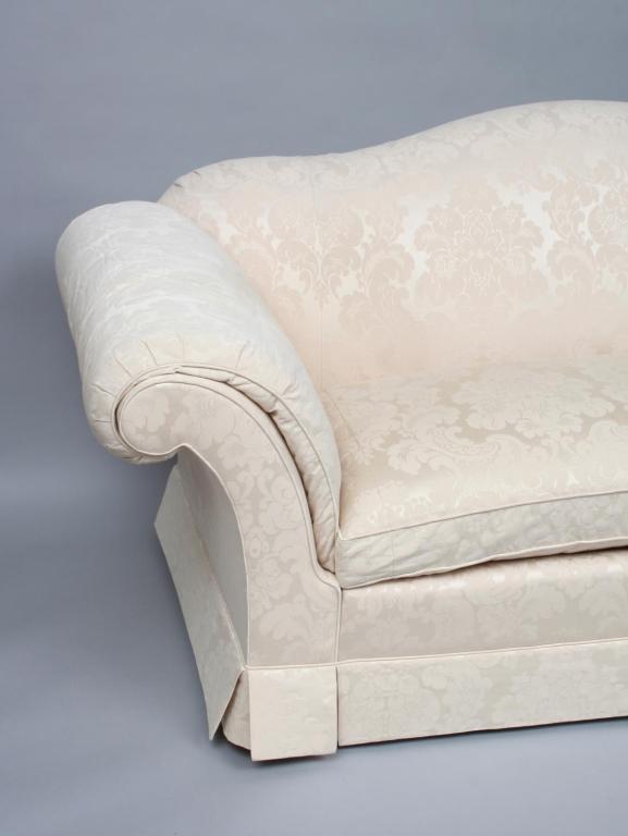 Baker Furniture Company, the camel back form with out scrolled arms, covered in cream colored damask upholstery, with Baker Furniture label. 36"H. 86"W. 34"D. Condition: excellent, no damage or repair.