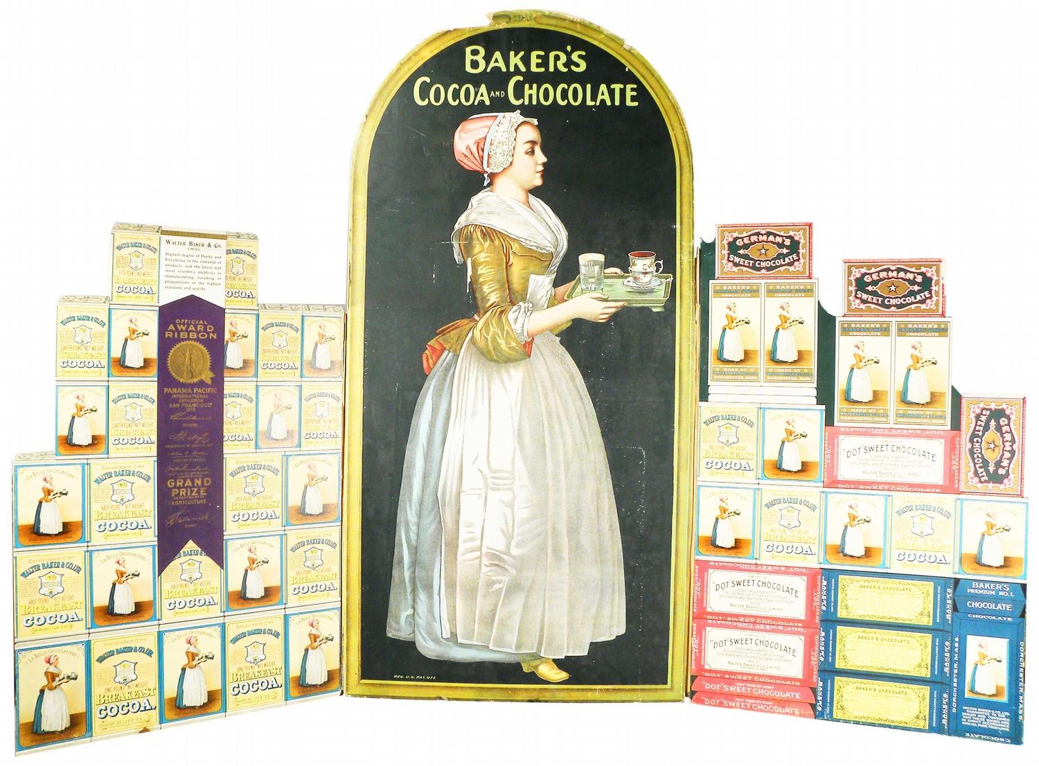 Baker's Cocoa Chocolate Die Cut Cardboard Tri-Fold Window Display. Some cardboard loss at 12:00 and a few insignificant scuffs otherwise good condition. 57 1/2 X 38 3/4 inches.