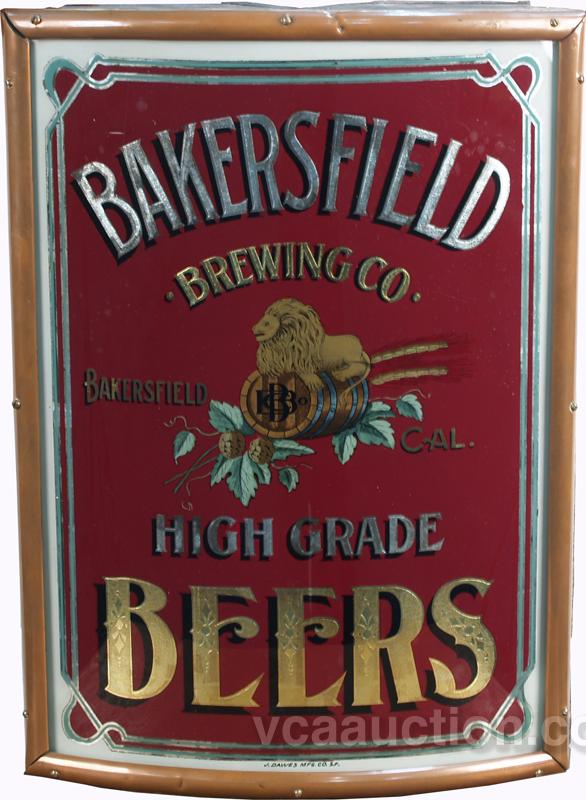 Bakersfield Beers, Brewing Co. Bakersfield, CAL. Curved Reverse Glass Sign MFG By J. Dawes MFG Co., S.F., All Original (One Of A Kind) - 17" x 23"