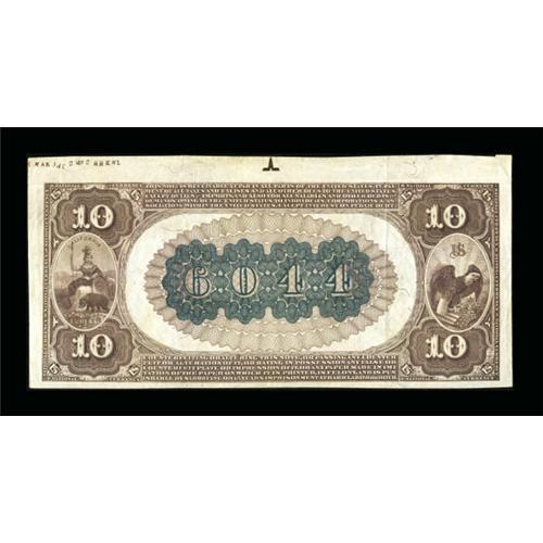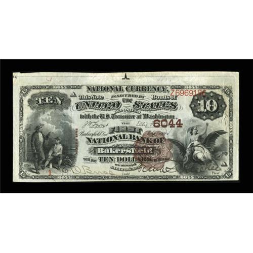<B>Bakersfield, CA</B></I> <B>- </B></I>$10 1882 Brown Back Fr. 490<B> The First NB </B></I>Ch. # 6044<B></B></I><BR> The first of an incredible Brown Back number 1 trio. This comes from a prohibitively rare Bakersfield bank which, despite a census population of eight confirmed pieces, was missing from every great California collection sold in the past twenty years, including both Colver and Horwedel. In fact, the last offering of any note from this bank came when this example was sold by Hickman Auctions as part of the Philip Krakover collection in March of 1990. There John, who was not one to enthuse in print about most notes, called it "A true blockbuster of a note. Rare, choice, and serial number 1, A position with full top margin intact. Pen signed in brown ink by E.D. Buss and Frank S. Rice Vice....One of the highlights of this entire collection. Notes of this caliber are only rarely available and are worth whatever they bring." <B>Extremely Fine-About Uncirculated,</B></I> a spectacular note from the very last bank in the state which could have issued Second Charter examples. <BR><BR><b>Shipping:</b> Coins & Currency (<a target="_blank" href="http://www.heritageauctions.com/common/shipping.php">view shipping information</a>)