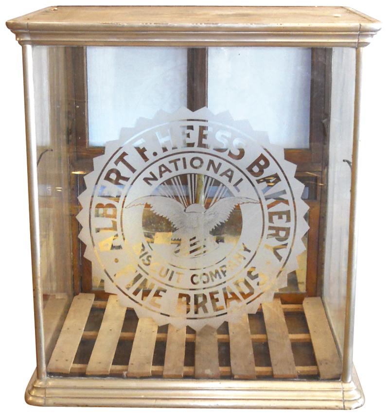 Bakery display case from Albert F. Heess Bakery-National Biscuit Company etched front, nickel silver