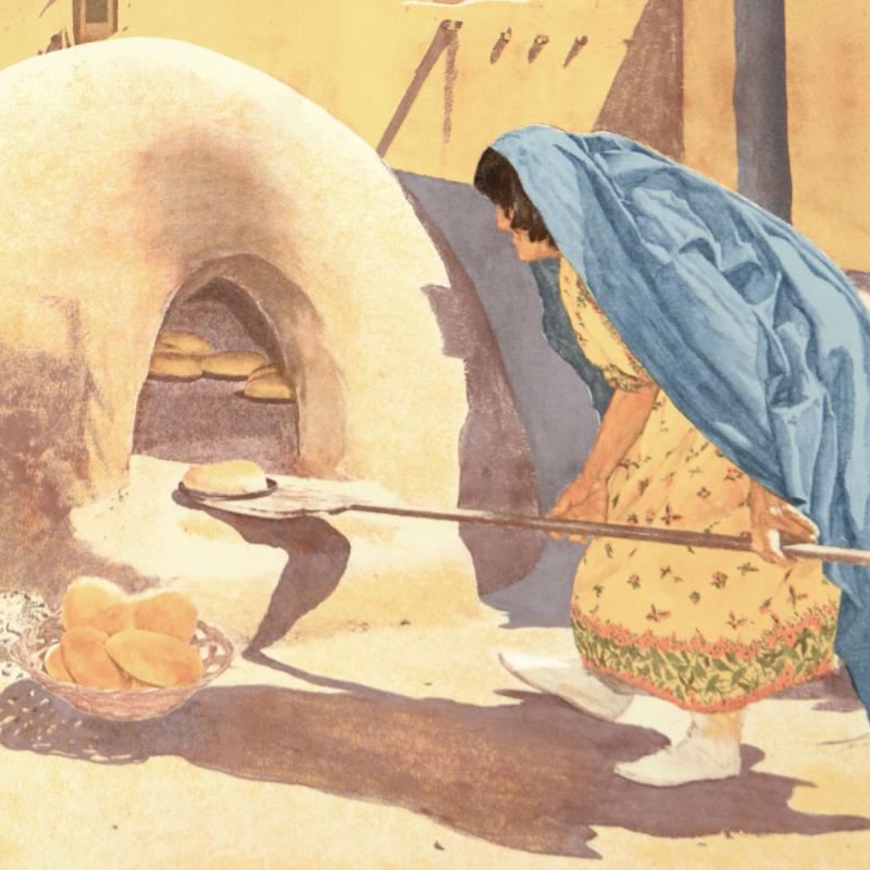 "Baking Bread" is a limited edition serigraph on paper by William Nelson, numbered and hand signed by the artist! Measures approx. 29" x 22" (with border); 25" x 18" (image).