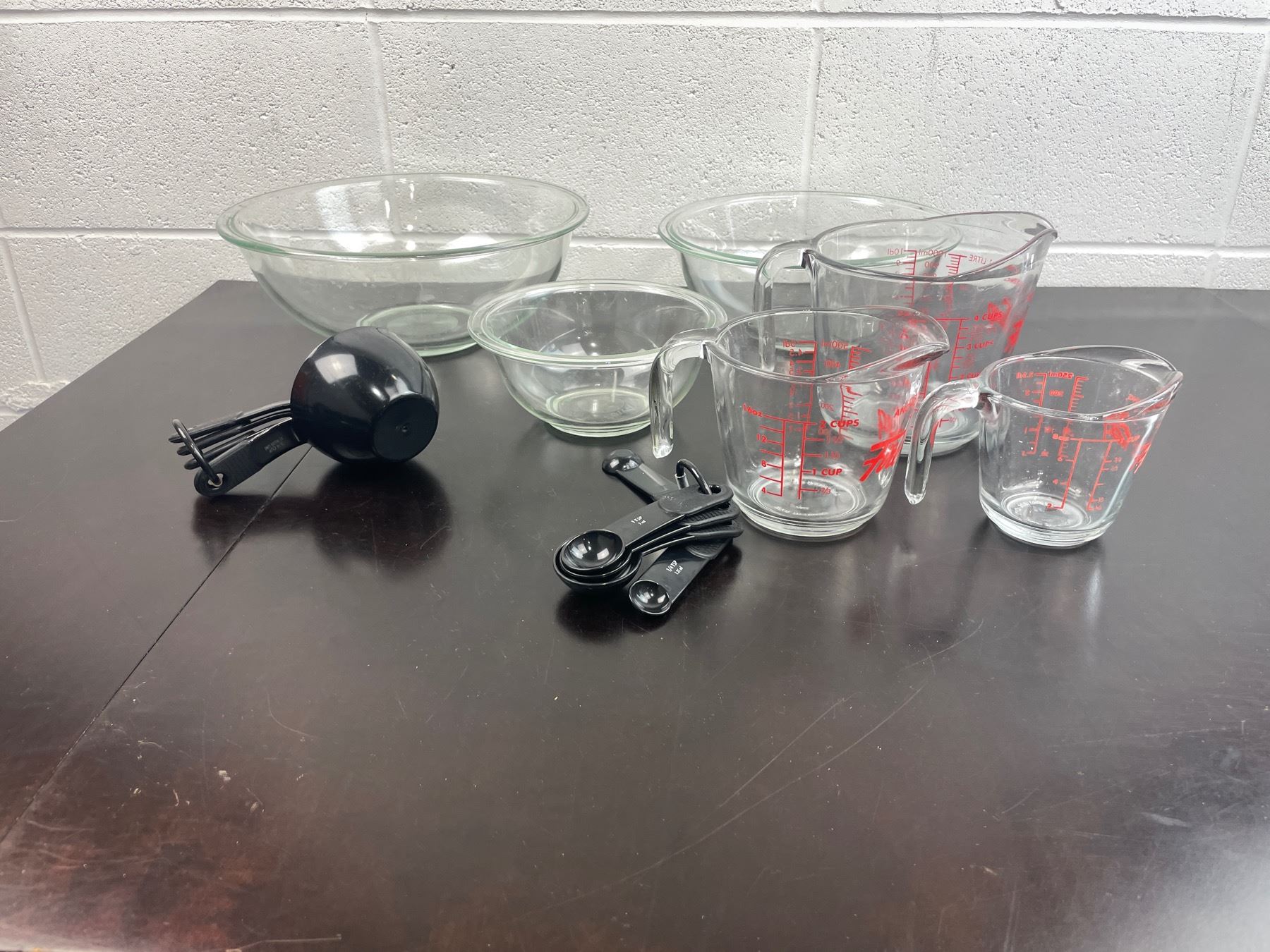 3 Pyrex bowls, measuring cups, measuring spoons, baking racks