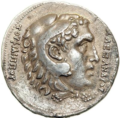 These commemorative, or "pedigree," coins were first issued by Agathokles and Antimachos I to show the dynastic lineage of their reigns. This tetradrachm, utilizing the Alexander the Great types, is particularly rare, and is missing in virtually every important Baktrian collection.