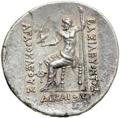 Baktria. Agathokles, c. 185-170 BC. AR "Pedigree" Tetradrachm (16.6 g). Head right of Herakles, wearing lion's skin headdress. Reverse: Zeus seated left, holding eagle and scepter; in front, monogram. Bopear. Série 12B; SNG ANS --. Very rare, porous. Details of Very Fine.