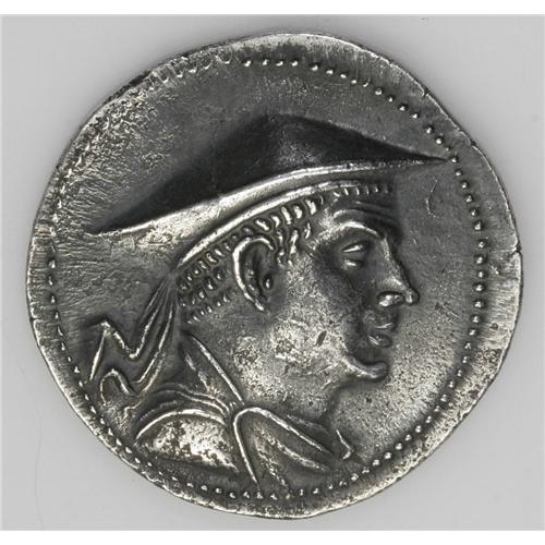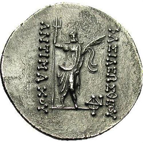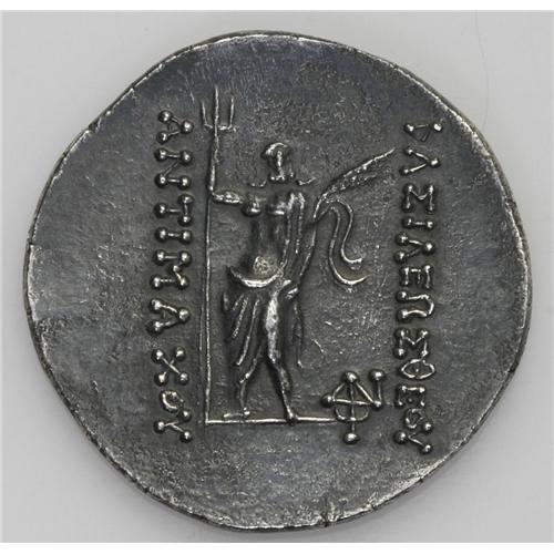 <B>Baktrian Kingdom. Antimachos I.</B></I> Ca. 174-165 B.C. AR tetradrachm (33 mm, 16.65 g). Attic standard. Diademed and draped bust right, wearing kausia / Poseidon standing facing, holding long trident and palm; monogram to right. Bopearachchi 1A; SNG ANS 274. Good VF, minor spots of porosity, artificially toned.