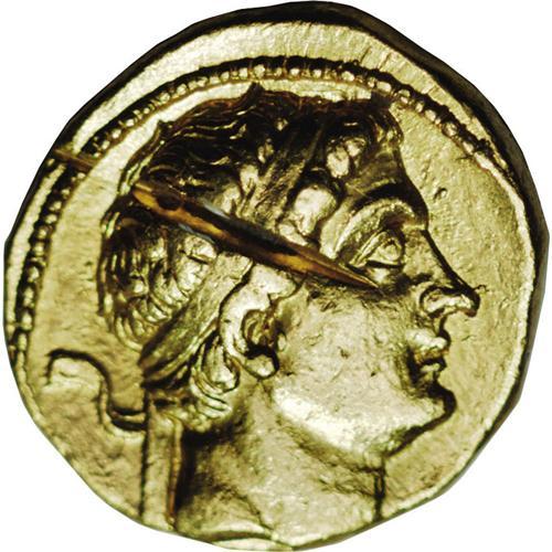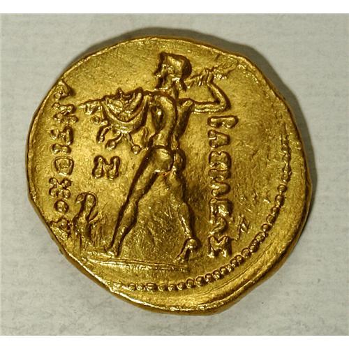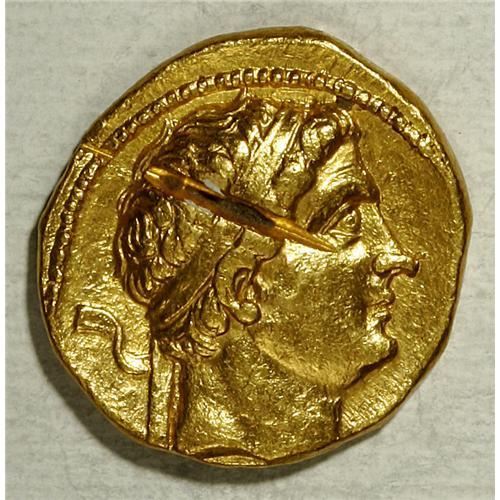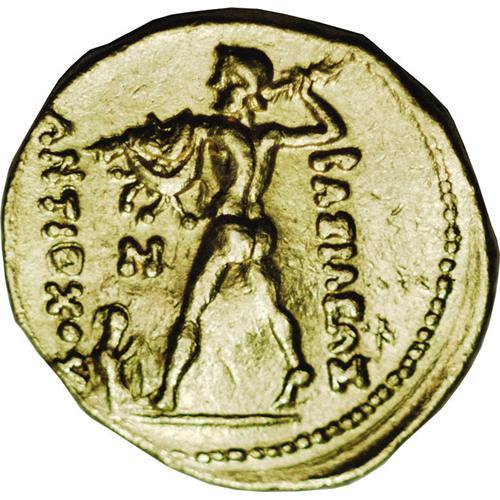 <B>Baktrian Kingdom. Diodotos I, in the name of Antiochos II of Syria.</B></I> Ca. 255-235 B.C. AV stater (19 mm, 8.23 g). Mint A, near Aï Khanoum. Diademed head of Diodotos I right / Zeus advancing left, holding thunderbolt and aegis, eagle at his feet; N in left field. SC 629; cf. Holt Series A, Group 7 (tetradrachm); Kritt -; Bopearachchi -; SNG ANS -. <B>EF,</B></I> test cut, slight bend. Because of the great number of specimens exhibiting the test cut always on the head of Diodotos, its purpose was official but we do not know why. Holt suggested that it was to reduce the weight standard from 8.6 g to 8.3 g during Euthydemos' revolt under Diodotos II, but this theory has now been discounted as many lower weight specimens without the test cut appeared in a recent hoard from India (see O. Bopearachchi and K. Grigo, "Thundering Zeus revisited," ONS Newsletter 169 (2001)).<BR><BR><b>Shipping:</b> Coin/Currency (<a target="_blank" href="http://www.heritageauctions.com/common/shipping.php">view shipping information</a>)