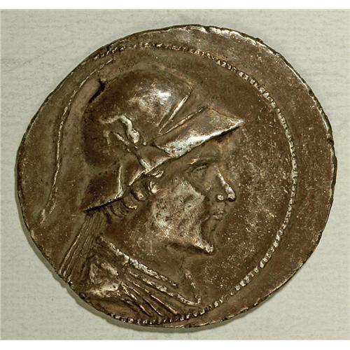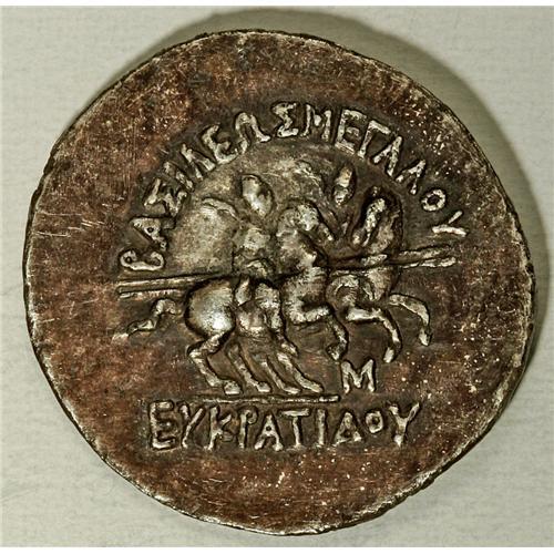 <B>Baktrian Kingdom. Eukratides I.</B></I> Ca. 171-145 B.C. AR tetradrachm (34 mm, 14.04 g). Diademed and draped bust right, wearing helmet adorned with bull's horn and ear / The Dioskouroi riding right, holding palms and spears; monogram below. Bopearachchi 6K; SNG ANS -. <B>Toned VF,</B></I> fields heavily smoothed.<BR><BR><b>Shipping:</b> Coin/Currency (<a target="_blank" href="http://www.heritageauctions.com/common/shipping.php">view shipping information</a>)