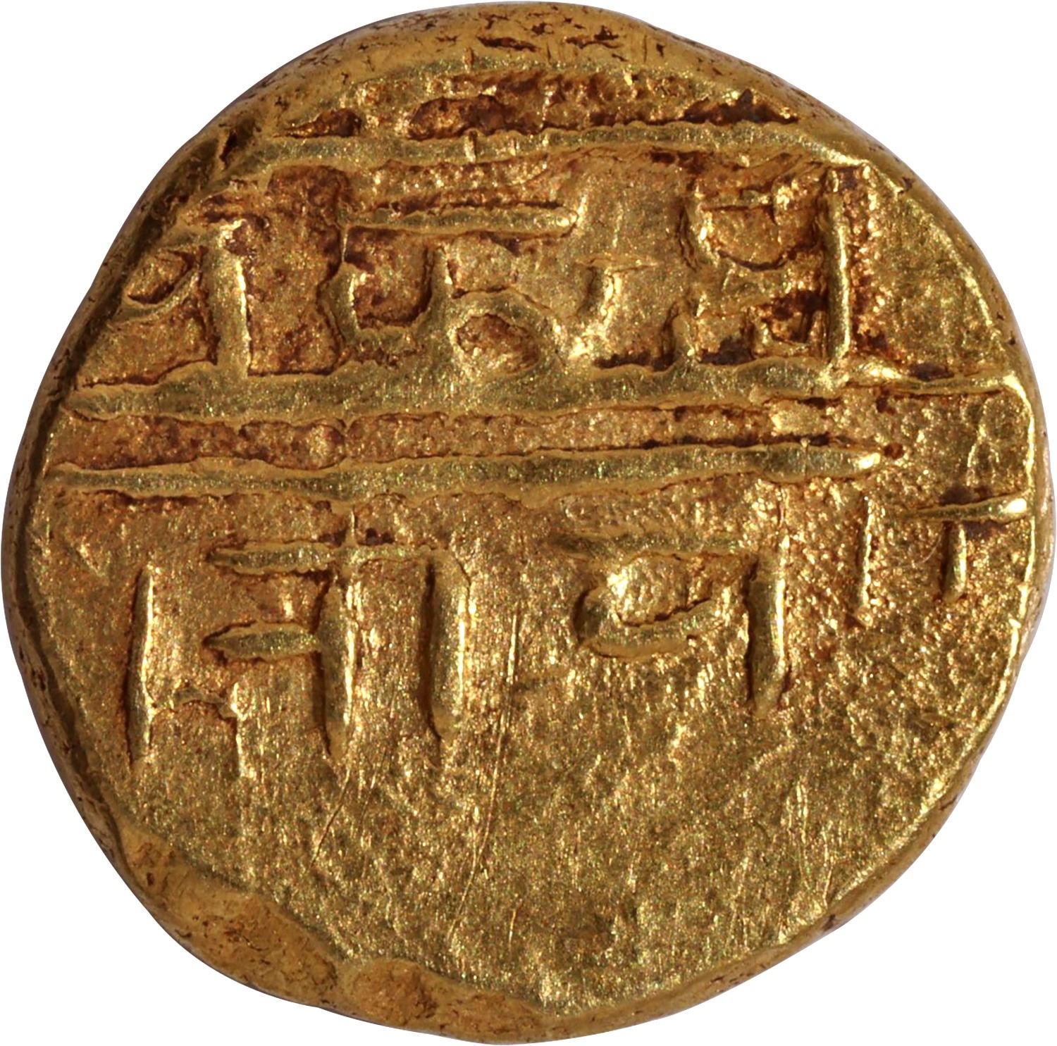 Vijayanagara Empire, Tuluva Dynasty, Krishnadevaraya (1509-1529 CE), Gold ½ Varaha, Obv: Balakrishna seated cross-legged, accosted by a conch (right) and a discus (left), with his left hand resting on his left knee and his right hand holding a lump of butter, a beaded bracelet, armlets and anklets adorning his chubby limbs, Rev: Nagari legend “(Shri pra/ta)pa krishna/raya” in three lines with interlinear rules, 1.7g, 10.43mm, (Dr. M. Girijapathi # 161), about very fine, Very Rare.