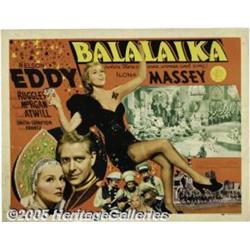 <B>Balalaika (MGM, 1939)</B></I> Half Sheet (22" X 28"). Nelson Eddy and Ilona Massey are lovers on different sides of the Russian Revolution in this musical from MGM. Prince Peter Karagin (Eddy) falls hard for the singer at the Cafe Balalaika, Lydia Marakova (Massey). Realizing that his princely appearance is not going to go over well with her, he pays a student for his clothes. Of course, she's hiding something, too -- she and several of her family are Bolsheviks plotting against the Tsar. The upheaval of politics and revolution conspire to keep the lovers apart, until they are reunited years later in Paris. Co-starring Charlie Ruggles, Frank Morgan, Lionel Atwill and C. Aubrey Smith. This beautiful half sheet has a full image of Massey, portraits of Massey and Eddy and three scenes from the film. Edge wear with three tears on the side borders with tape on the back, soiling and stains (mostly on the border), light wrinkling and small chips on the lower border. Rolled, Fine/Very Fine.