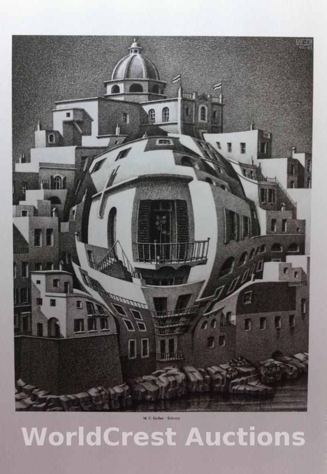 M. C. Escher Balcony, 1945 Lithograph "The spatial nature of these houses is a tiction. The two-dimensional nature of the paper on which they are drawn is not disturbed - unless we give it abulge from behind." M. C. Escher