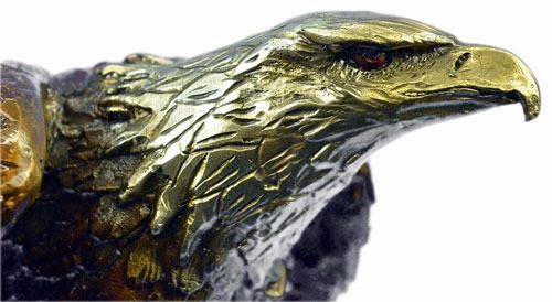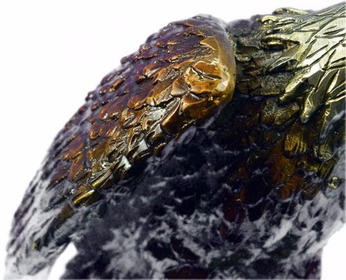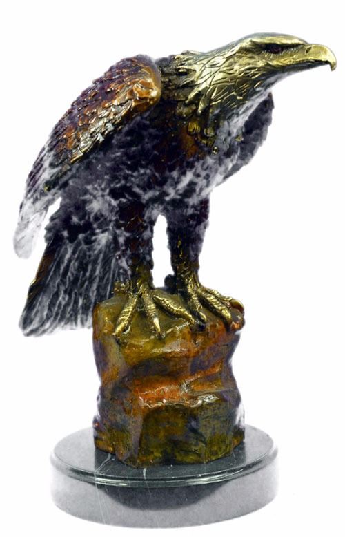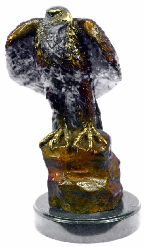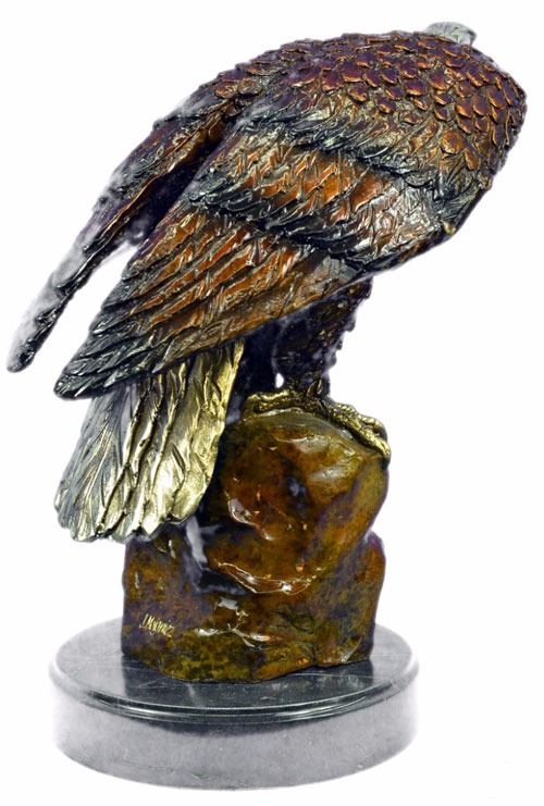 The full bodied bird lands on a rock after a long flight away from the cold, stormy winters. This bird perches high up to see the vast land below. The feathers on the sculpture exhibit significant detail done by the artist. It is a beautiful depiction of the natural world. This sculpture rests on a black marble base. It was designed using the lost wax method. Bronze dimensions with marble base: Height 14 X Width 15 inches. Weight: 20 lbs. Please Note: This is a reproduced bronze sculpture from the original molded and signed. This featured bronze sculpture is a recast after the original, and has been done recently. This 100% bronze sculpture is an abstract piece certain to be a conversation piece.
