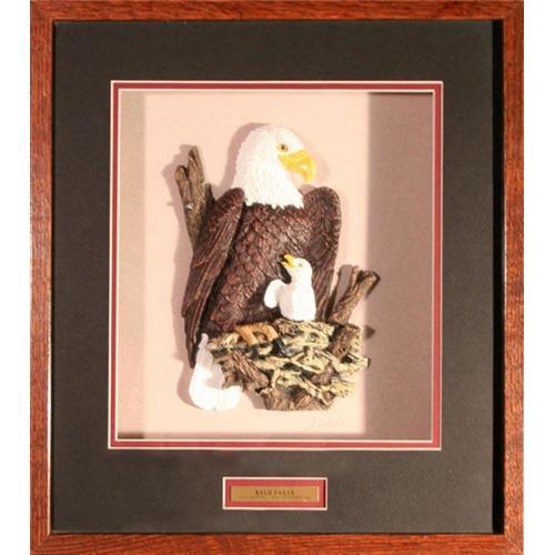 ?Bald Eagle? is a very unique piece of art that combines sculpture, painting, and visual presentation to create an extremely interesting 3D work. The bald eagle that is majestically sitting with its baby in their nest is a hand casted piece of plaster, which was then meticulously painted. The coloring is vibrant and exudes a life like quality that is truly remarkable. This handmade sculpture has a great amount of detail, with intricate line work to distinguish the feathers and even glass eyes that stare out from the eagles? heads. It has been mounted on an oatmeal colored background that is neutral, thus, allowing the sculpture to really show to advantage. A dark walnut shadow box frame, running about 2 ½? deep, encompasses the piece. It nicely complements the umber tones in the sculpture while remaining a classic choice to showcase this work of art. It has also been double matted with a beautiful burgundy bottom mat and a top black mat, both of which add a touch of elegance to the work. Since it is in a shadow box, the mats are expertly propped up away from the back, creating a wonderful feeling of depth. This amazing piece comes with a gold name plate that reads, Bald Eagle: Haliaeetus Leu Logephalus, which has been cleverly inset into the top mat. The artist, Fields, has also signed the piece just below the bottom of the sculpture in pencil. In totality, this intriguing work of art measures 17 1/8? x 19 1/8? and is truly a tribute to one of nature?s most regal birds. The high ...