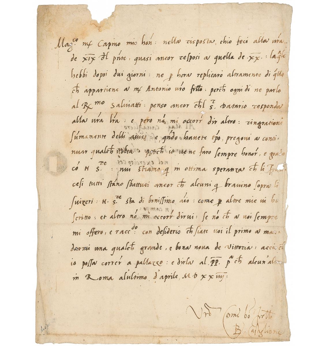 Prominent author (1478–1529) most famous for The Book of the Courtier, considered the definitive account of Renaissance court life. Extremely rare LS in Italian, signed “Vostro come bon fratello, B. Castiglione,” one page, 8.5 x 11.5, April 30, 1524. Untranslated letter written on the day of the Battle of Sesia to Capino da Capo, a soldier in the imperial service. Castiglione desires to have a defeat of King Francis I reported to him immediately, so that he can be the first to bring this good news to Pope Clement VII, who, at that time, was allied with Charles V. In very good condition, with an area of paper loss to the top edge, a few small edge tears and ink erosion (slightly affecting a few words of writing but not the signature), and scattered creases and soiling. Accompanied by a full transcript. The Spanish-Imperial forces commanded by Don Carlos de Lannoy inflicted a decisive defeat over the French forces during the Battle of Sesia, a pivotal moment in the Italian War of 1521–26.