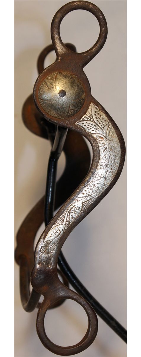 Marked Baldwin Canon City Prison Silver Bit; a great silver inlaid "S" shank bit, attractively engraved with 1" conchos, a nice port mouthpiece and original lipbar. Clearly marked "9647" on the inside of the shank.