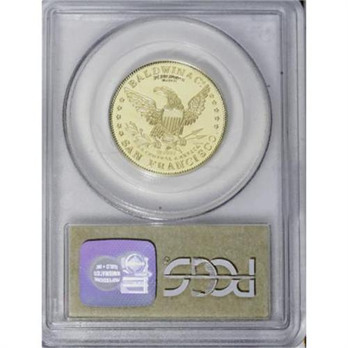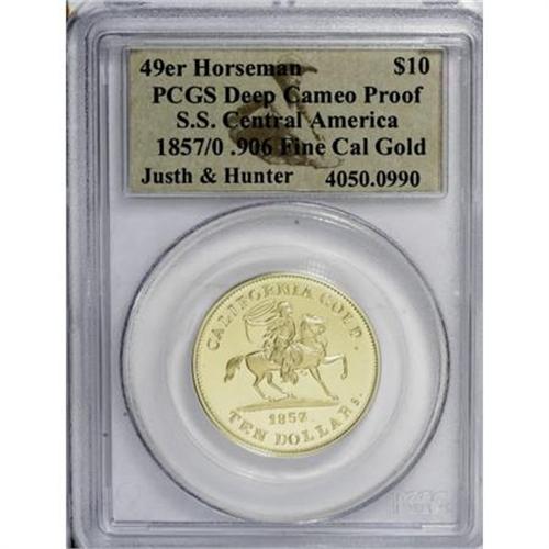 <B>Baldwin & Co. $10 'Restrike' Deep Cameo Proof PCGS.</B></I> This interesting relic medal was struck by the Royal Canadian Mint from gold alloy taken from a Justh & Hunter ingot, which in turn was recovered from the treasure ship S.S. Central America. Dated 1857/0, the 1850 was the date of the genuine Baldwin "Horseman" ten, and 1857 was the year of the SSCA shipwreck. Fully struck and essentially perfect. The presentation box, fact sheet, and certificate of authenticity accompany.<BR><BR><b>Shipping:</b> Coins & Currency (<a target="_blank" href="http://www.heritageauctions.com/common/shipping.php">view shipping information</a>)